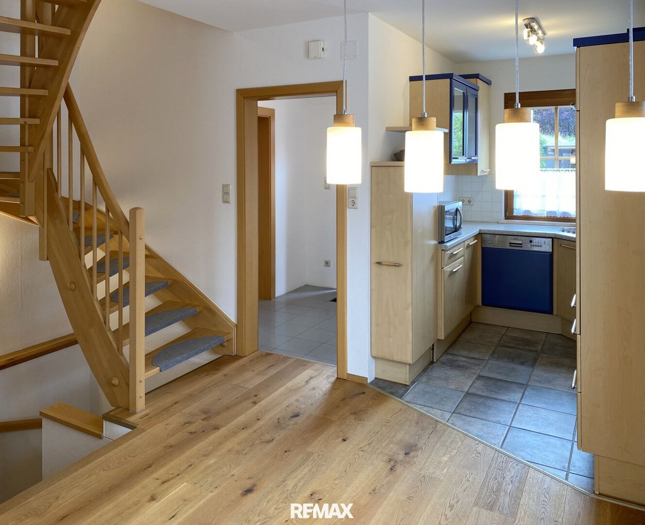 Der Eingangsbereich führt Sie zunächst am Gäste-WC vorbei, dann öffnet sich bereits der gemütliche Wohnbereich. Die Küche gleich linker Hand ist funktional geschnitten und gut belichtet – mit einem Blickfenster zu den eigenen Parkplätzen. So behalten Sie das Geschehen vor dem Haus immer im Auge.