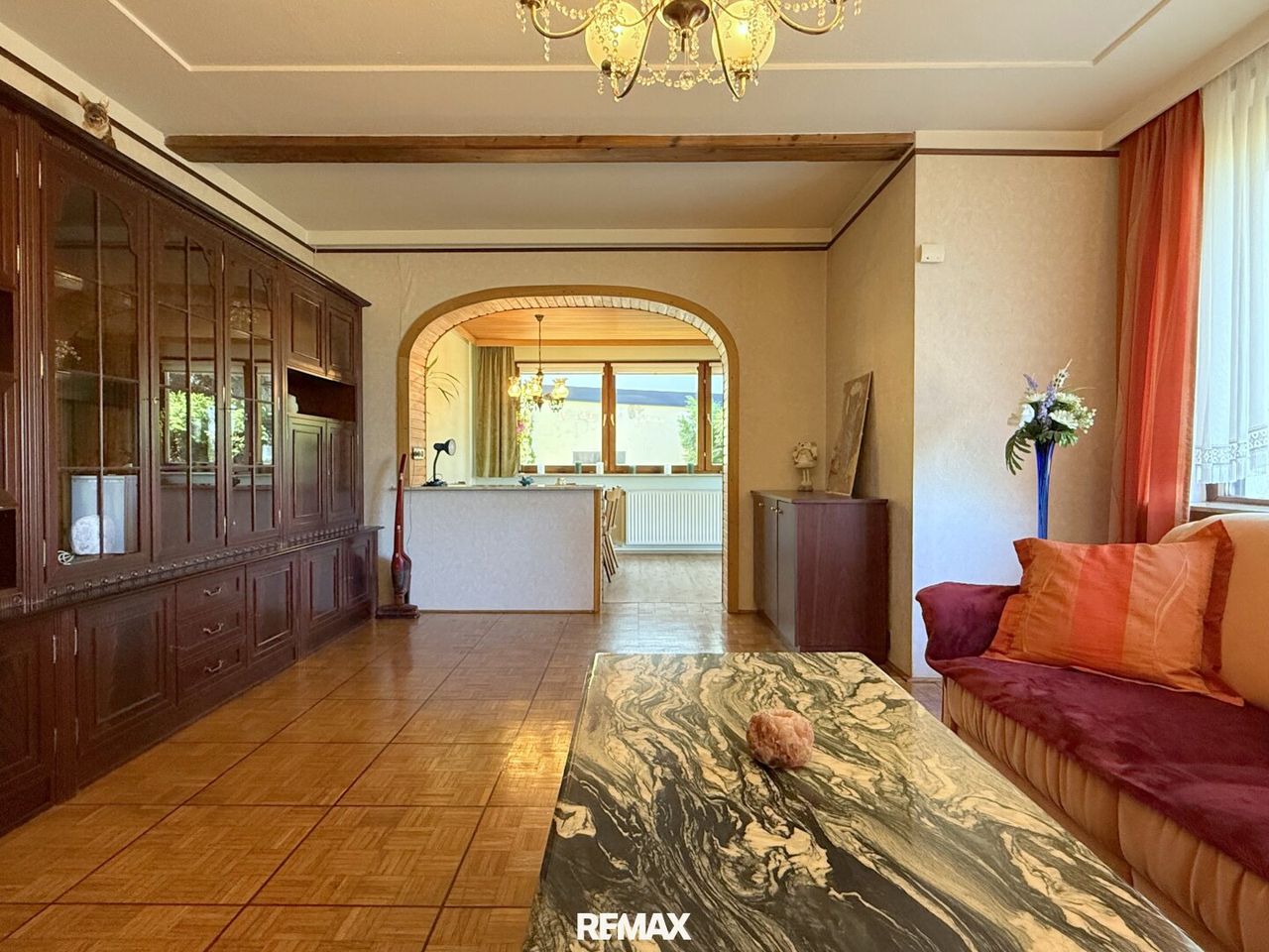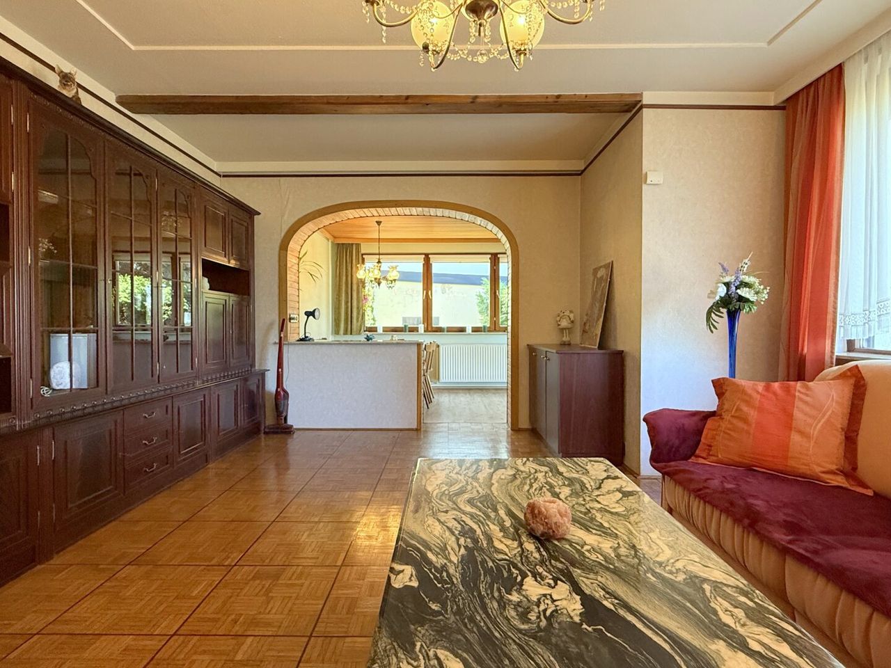 Ein Rundbogen öffnet den Raum zur einstigen Terrasse, heute fest verwoben mit dem Wohnzimmer, ist das Herzstück für alles, was man feiern, planen und genießen will. Ein großer Tisch steht hier wie ein stiller Gastgeber, der schon Geschichten von langen Spieleabenden, ausgedehnten Familienessen und spontanem Sonntagskaffee kennt. Hier wird nicht nur gegessen – hier wird gelebt, gelacht und manchmal sogar über den Sinn von Zeit diskutiert. Ob kreative Bastelstunden, ein ruhiger Moment mit einem Buch oder das laute Durcheinander einer Geburtstagsrunde – dieser Platz macht alles mit. Und zwischendrin fragt man sich manchmal, wie ein Raum so viel Gemütlichkeit auf einmal fassen kann.