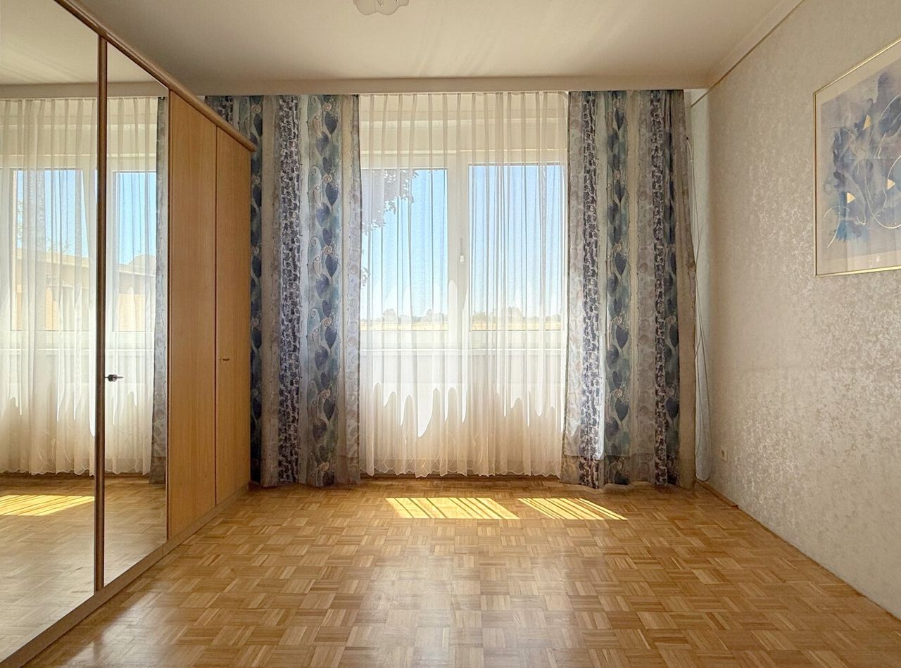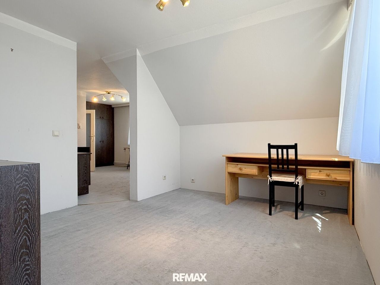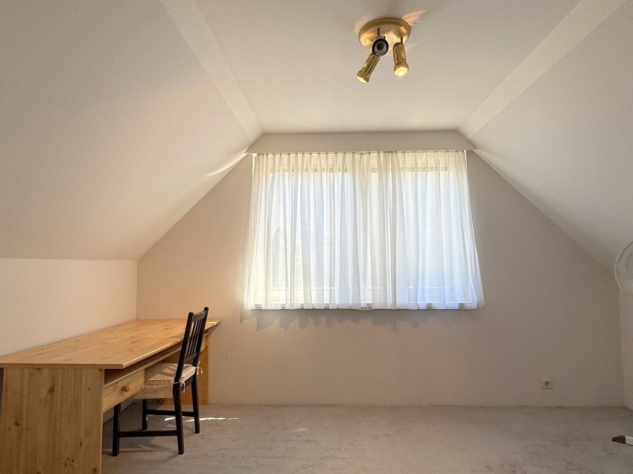 Auf der einen Seite ein großes, geradliniges Zimmer ohne Schrägen, mit dem Blick hinaus auf Felder, Garten und den Tag, der irgendwo da hinten langsam beginnt. Ein Raum für Ruhe, Ordnung – oder auch für das Chaos, das manchmal dazugehört.