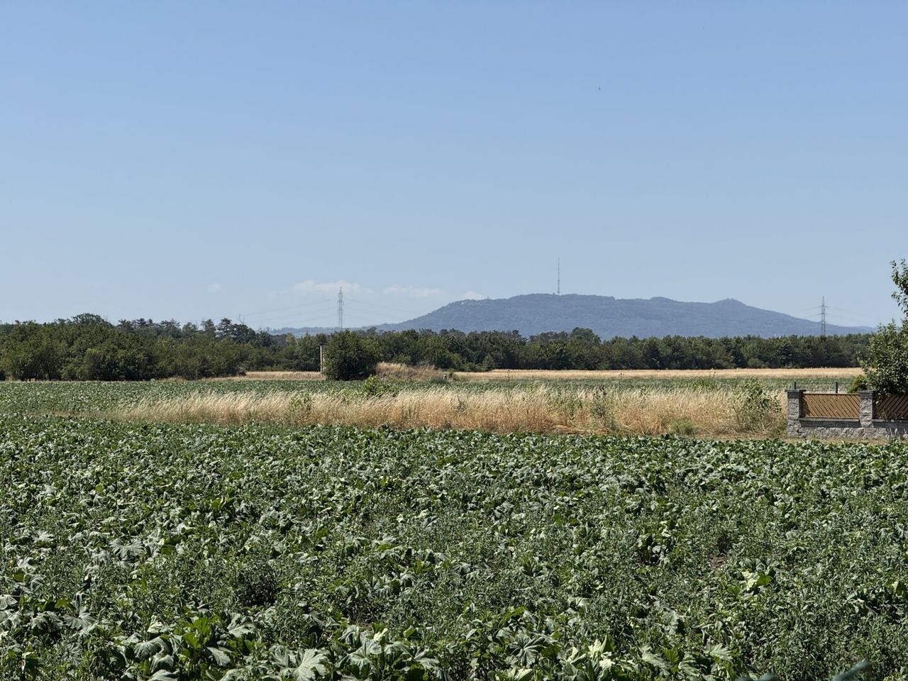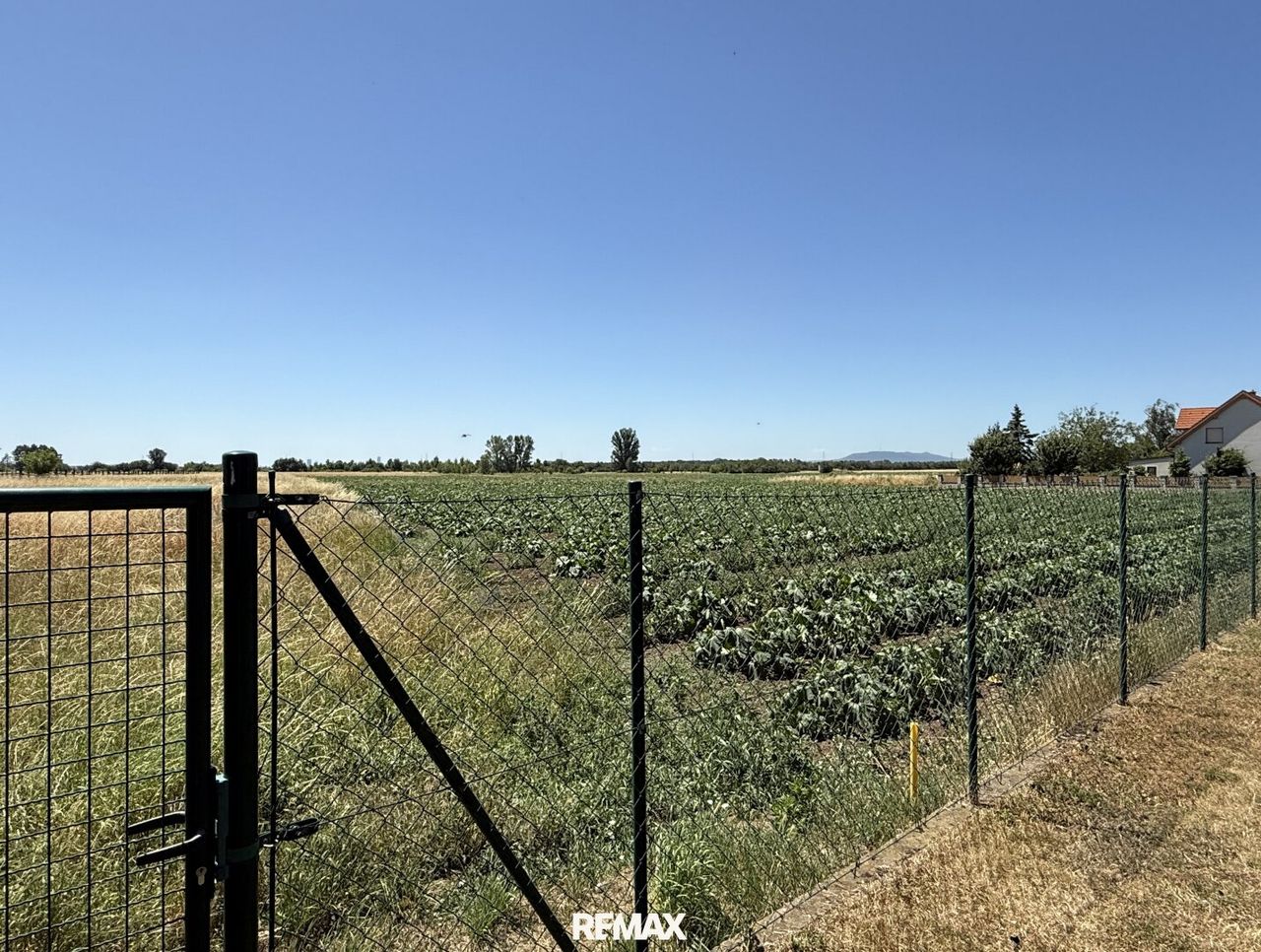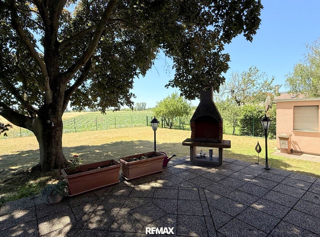 Dahinter öffnet sich der Garten in sanfter Weite, eben und großzügig, mit einem mächtigen Blutahorn, der als stiller Wächter Schatten spendet. Das Feld hinter dem Garten scheint fast grenzenlos, hier fühlt man fast das Marchfeld mit jedem Atemzug. Gemüse wird vom Bauern gepflanzt und am Horizont färbt der Kahlenberg die Abendsonne in ein warmes Rot.