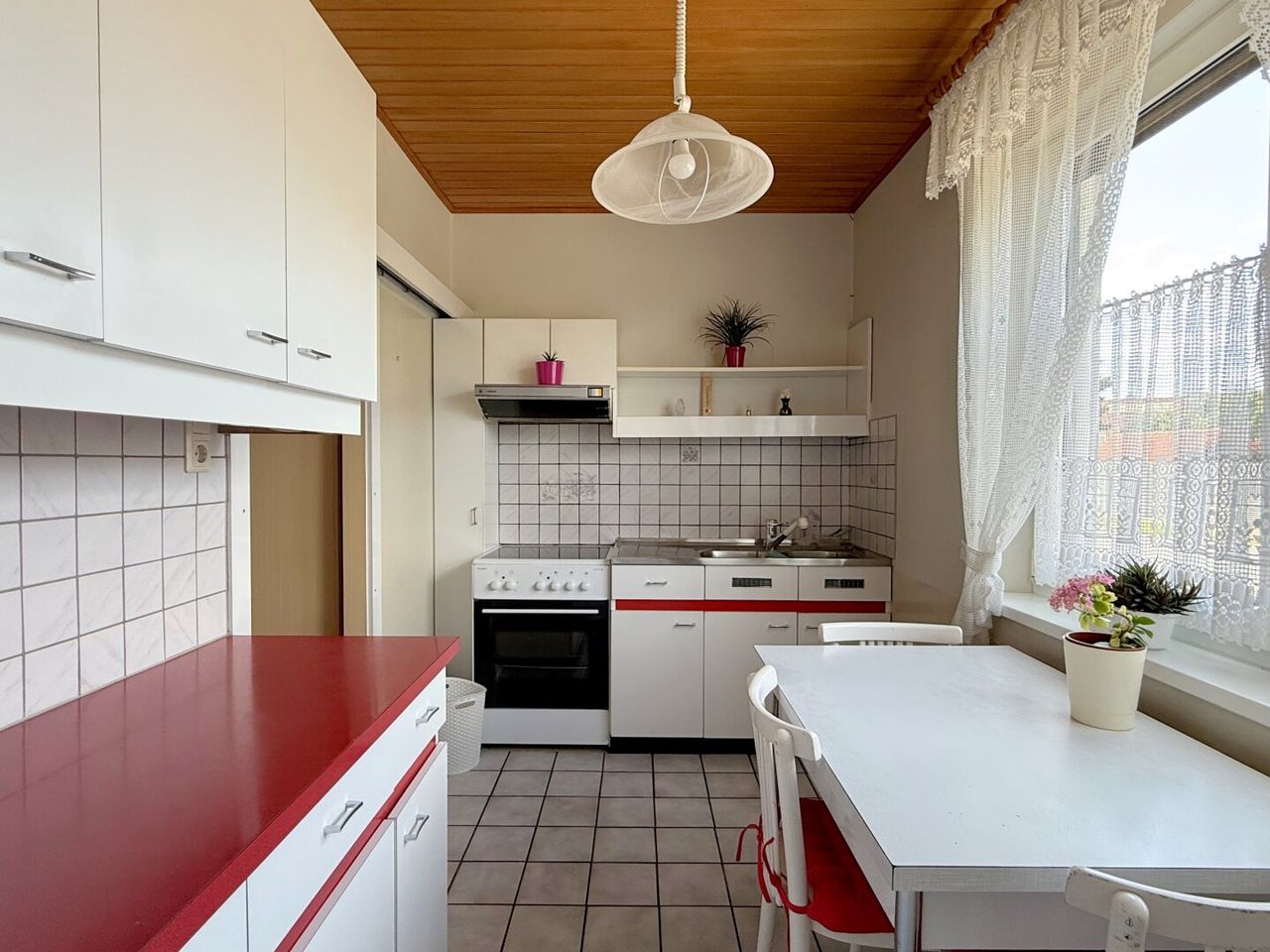 Vis-à-vis vom Wohnzimmer liegt die Küche, die mit einem Augenzwinkern an Oma erinnert: klein, mit Rüscherl-Vorhängen, die Geschichten von längst vergangenen Tagen erzählen, und einem kleinen Sitzplatz für den schnellen Kaffee-Tratsch. Ein Platz mit Blick auf die Straße, immer alles genau im Visier.