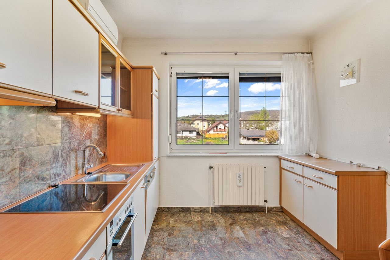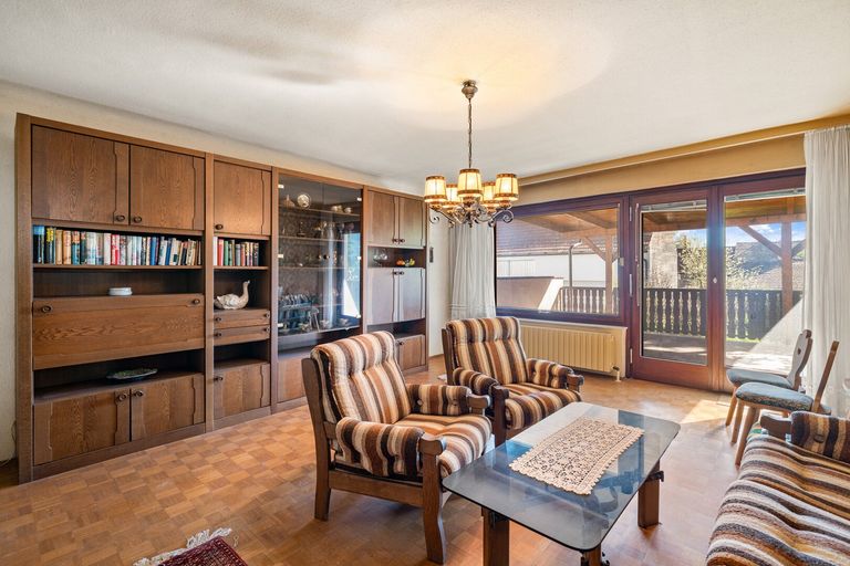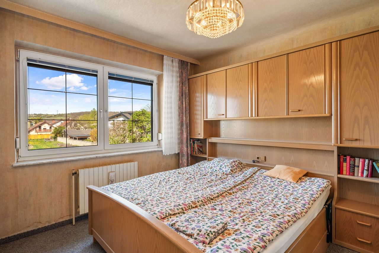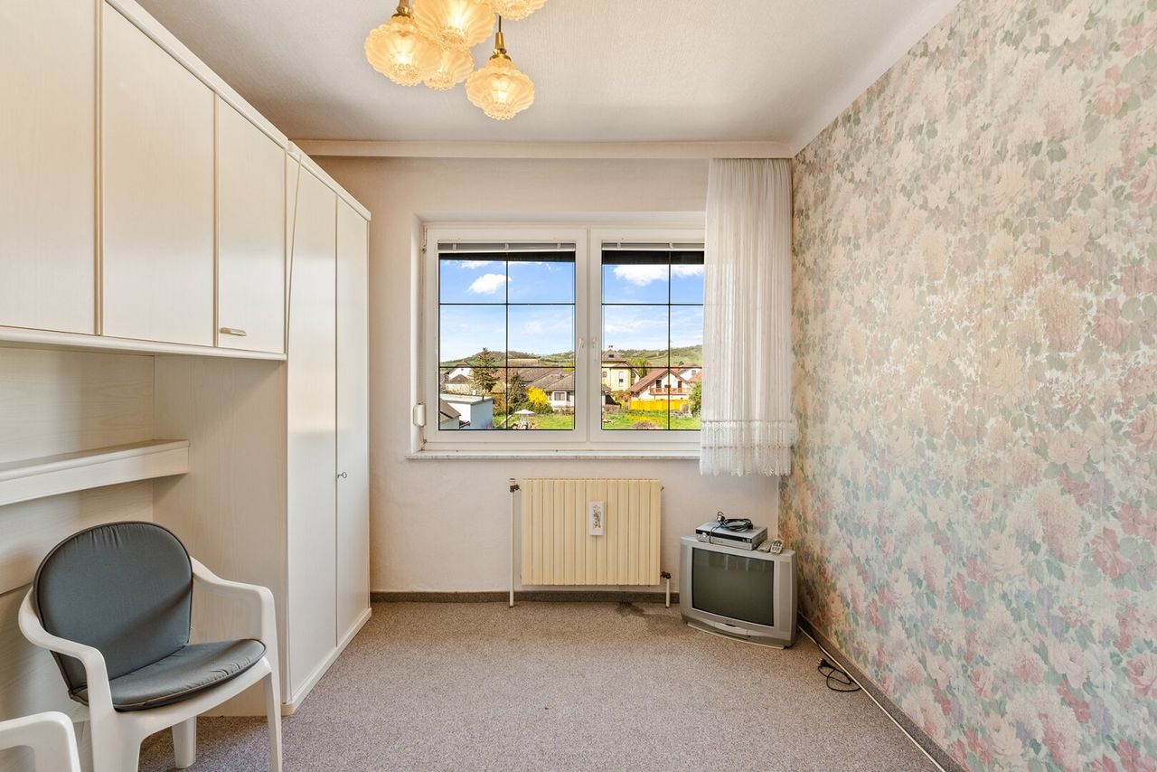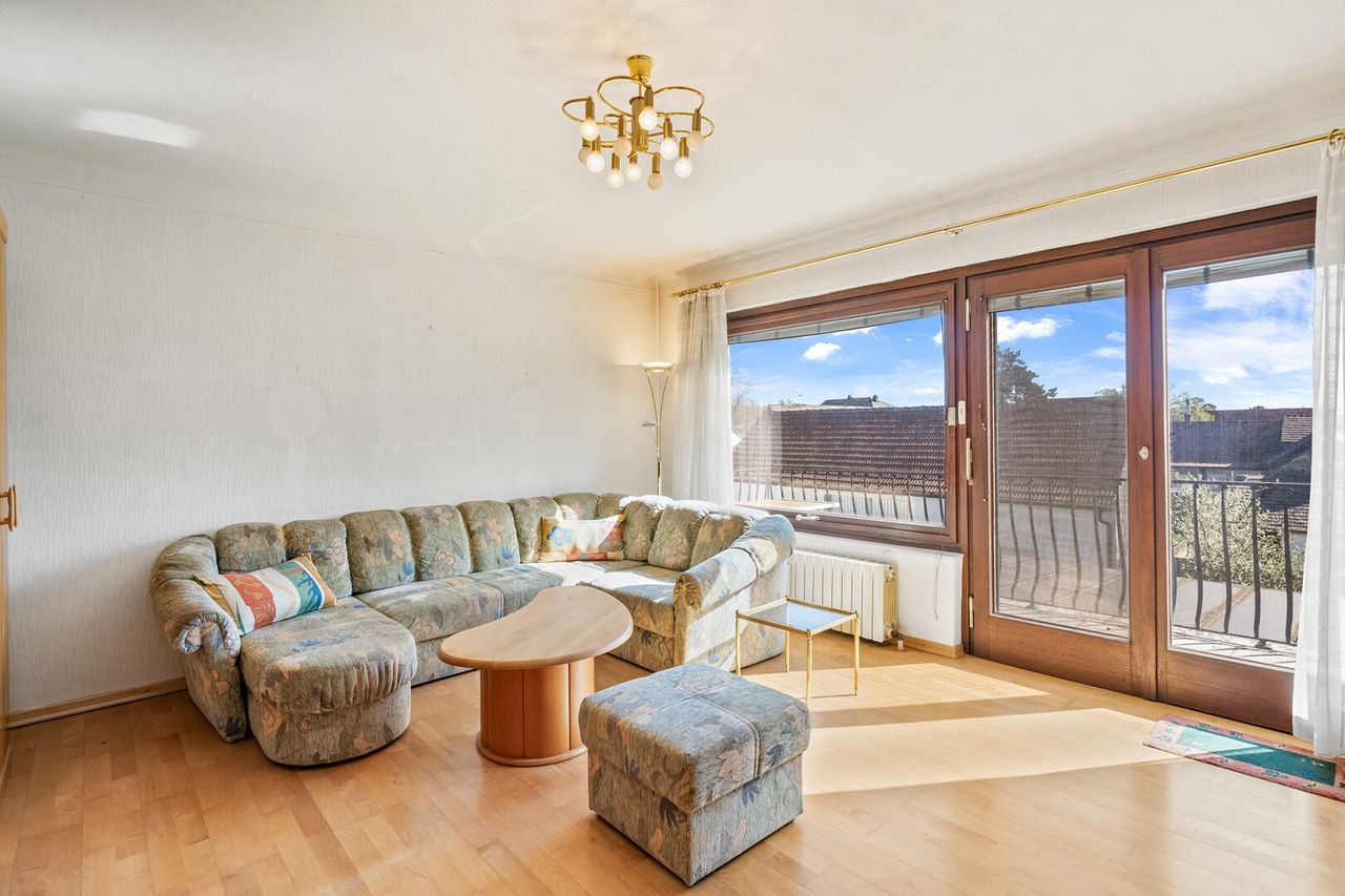 Das Obergeschoss umfasst 4 Zimmer und bietet reichlich Platz für Familie, Arbeiten oder Gäste. Aktuell sind hier 2 Schlafzimmer, 1 Küche, 1 Wohnzimmer sowie ein Bad mit Dusche und 1 WC vorhanden. Der Balkon (ca. 7,95 m², laut Angabe) bietet einen schönen Blick ins Grüne, schafft zusätzliche Freifläche und unterstützt das Konzept eines zweiten Wohnbereichs.