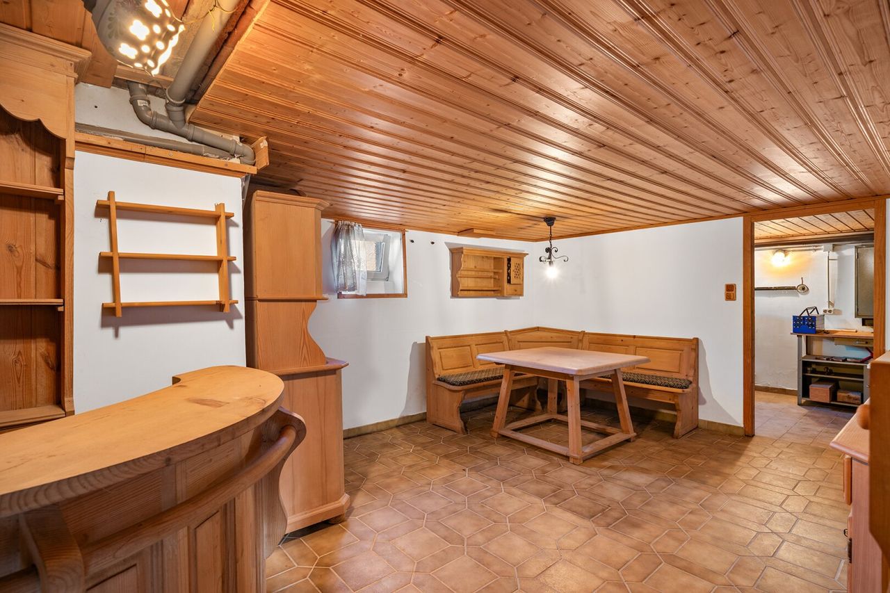 Der Keller bietet weit mehr als klassische Lagerflächen: Ein liebevoll gestalteter Barbereich mit handgefertigter Holz-Bar sowie eine gemütliche Sitzecke schaffen einen besonderen Ort für gesellige Abende. Zusätzlich überzeugt der Keller durch Tageslicht und mehrere abgeschlossene Räume, die vielfältige Nutzungsmöglichkeiten eröffnen.