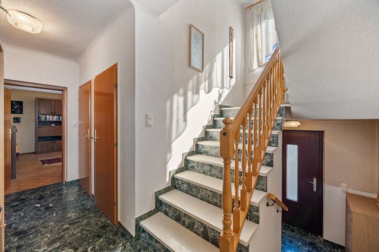 Im Erdgeschoss stehen 3 Zimmer, 1 Küche, ein großzügiger Wohnbereich sowie ein Schlafzimmer zur Verfügung. Ergänzt wird die Ebene durch ein Bad mit Badewanne und ein separates WC – eine klassische, sehr funktionale Familienaufteilung.