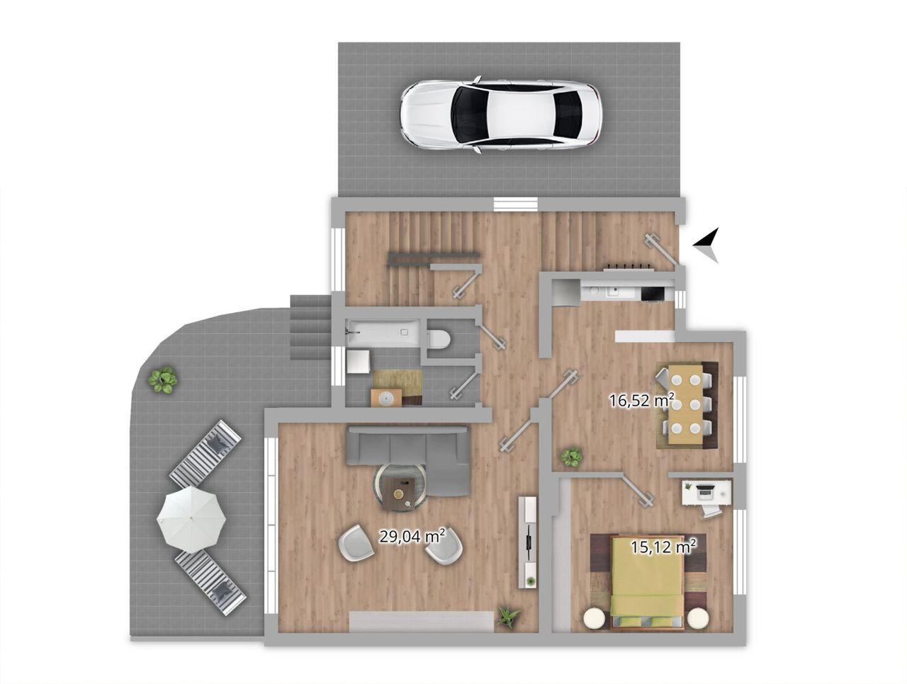 Ein seitlich gelegenes Carport ergänzt die Parkmöglichkeiten und bietet einen weiteren komfortablen Stellplatz.