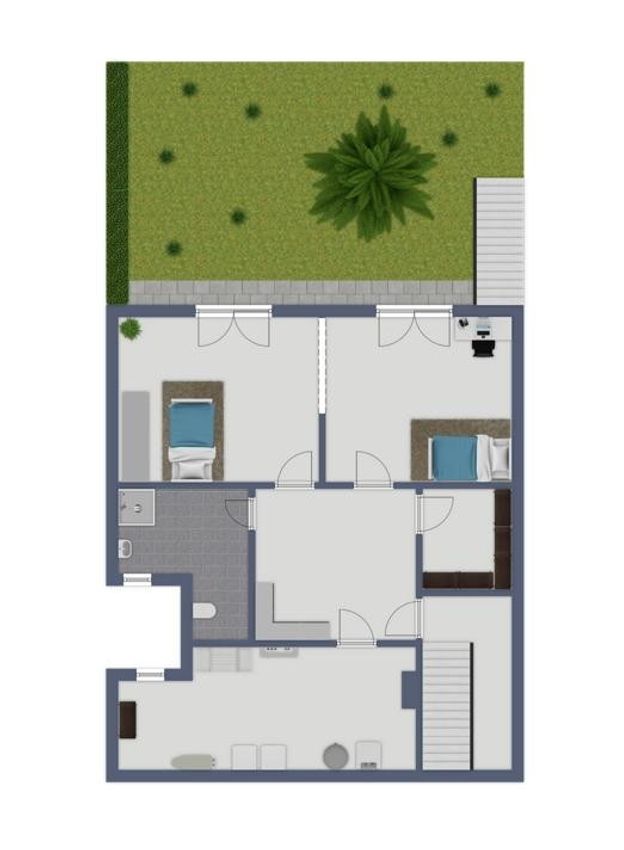 Die 2002 errichtete und 2025 renovierte Villa selber ist sehr großzügig angelegt, mit einem im Erdgeschoß offenen Küchen-, Ess- und Wohnbereich (zusammen ca. 120 m²), von dem man auf eine südseitig ausgerichtete, 36m² große balkonartige Terrasse gelangt. Der Garten ist über eine Treppe direkt erreichbar. Die Küche besticht mit einer exquisiten Ausstattung, Granitoberplatten und einer Kücheninsel.
