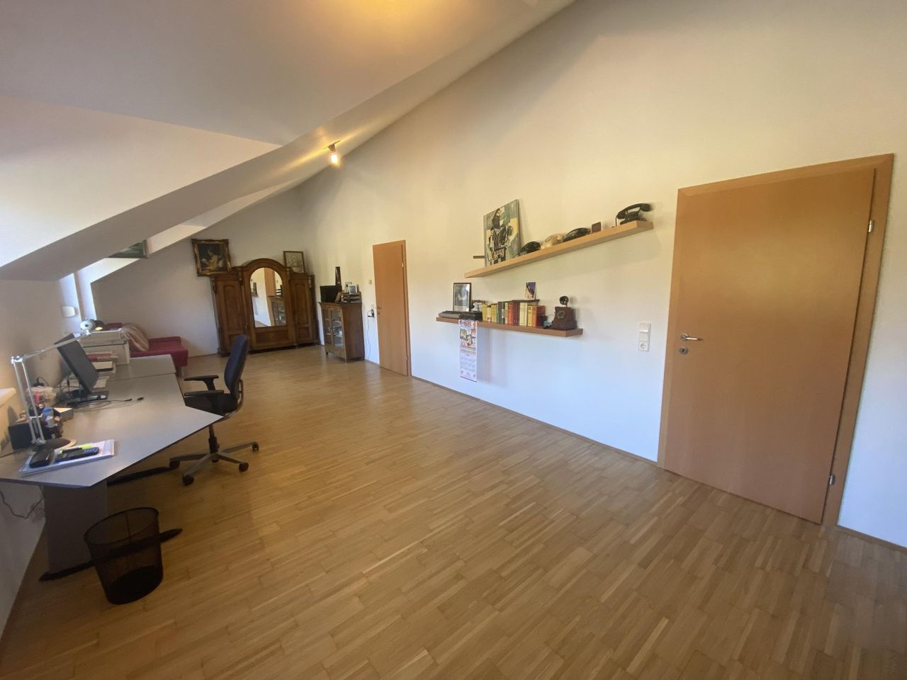 Ins Obergeschoss gelangt man über eine offene Treppe zu einer Balustrade mit Blick hinunter ins Wohnzimmer und Zugang zu einem ca. 40m² großen nordseitigen Arbeitszimmer, das sich durch Einziehen einer Zwischenwand in zwei getrennt begehbare Räume verwandeln lässt. Dank des schnellen Internets über das Glasfaserkabel (150 Mbps Download + 50 Mbps Upload) eignet sich der Standort perfekt für ein Home Office. Von der Balustrade führen Treppen ins Badezimmer, bzw. direkt in das große Schlafzimmer, von dem aus man auf den südseitig gelegenen Balkon kommt, um die grandiose Aussicht über viele Kilometer hinweg, an klaren Tagen bis hin zum Schneeberg, genießen kann...