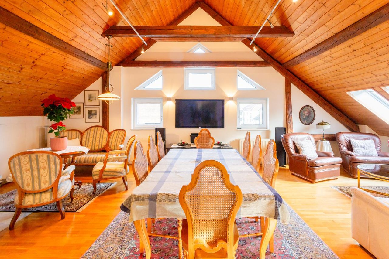 Diese außergewöhnlich große Liegenschaft bietet ein enormes Flächenangebot, flexible Nutzungsmöglichkeiten, eine hochwertige Dachgeschoss-Erweiterung samt modernem Hallenbad sowie ein beeindruckendes Grundstück mit rund 3.955 m² Gesamtfläche.
