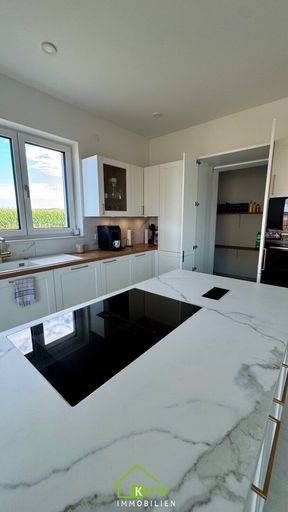 Ein wahres Highlight ist die offene Küche mit Insel, welche einen versteckten Raum/Speis bietet.