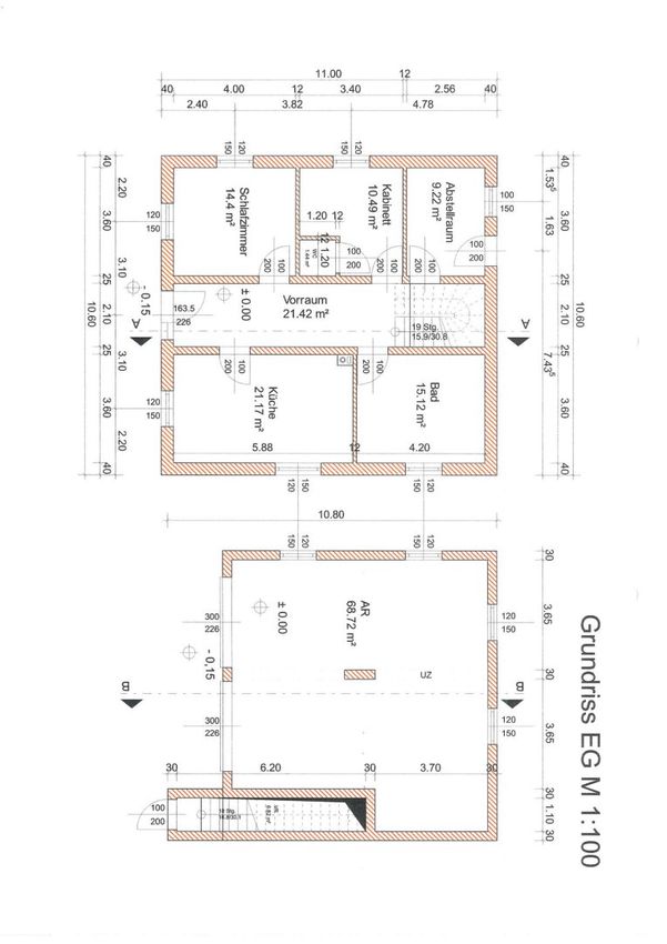 Das Wohnhaus wurde 1970 nach dem beiliegenden Einreichplan in Massivbauweise mit Vollkeller (116m²) , Wohngeschoß (114 m²) und Satteldach mit Eterniteindeckung vorne an der Landstraße errichtet.