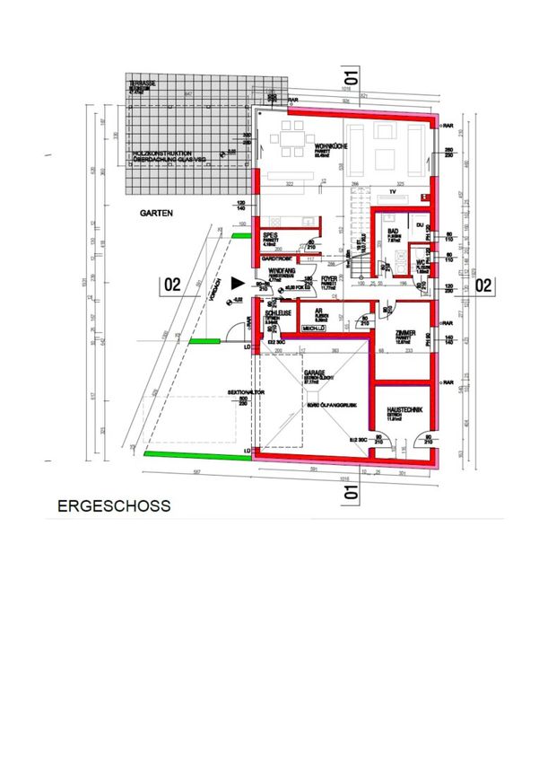 EG: Windfang, geräumiges Vorzimmer, zentrales Treppenhaus, Wohnküche samt Essbereich und Wohnbereich mit Terrassen und Gartenzugang, Bad mit Dusche und Wanne, Schlafzimmer, Abstellraum, Schleuse und Haustechnik-Raum
