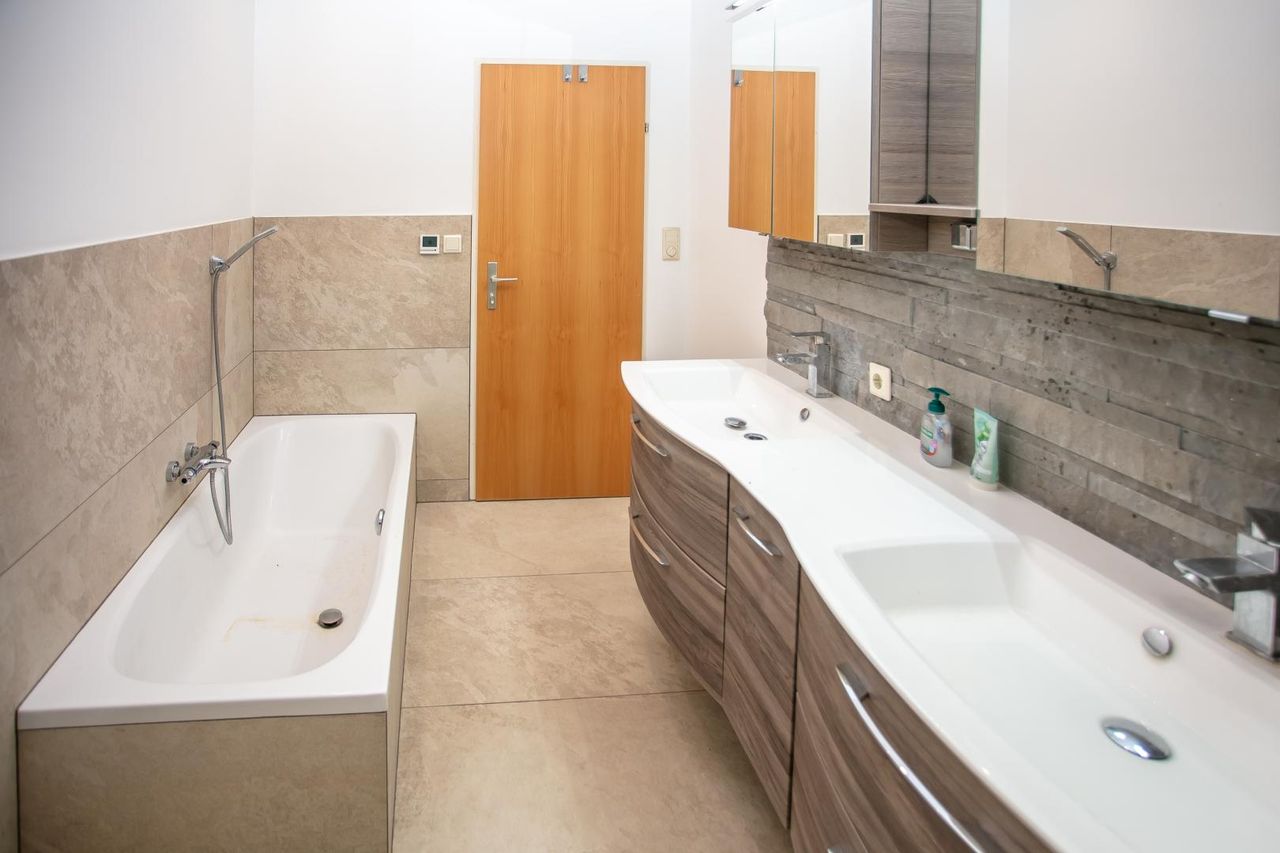 • Großes Badezimmer mit Wanne, Dusche, Doppelwaschbecken und WC
