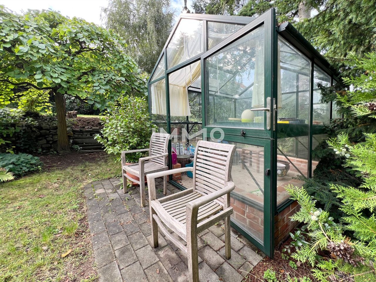 Das 1.242 m² große Grundstück steigt terrassenartig an und eröffnet dadurch immer neue, reizvolle Perspektiven – sei es auf blühende Gärten, sonnige Sitzplätze oder stille Rückzugsorte im Schatten alter Bäume. Hier lässt sich Natur erleben – ganz privat und doch mit viel Weite.