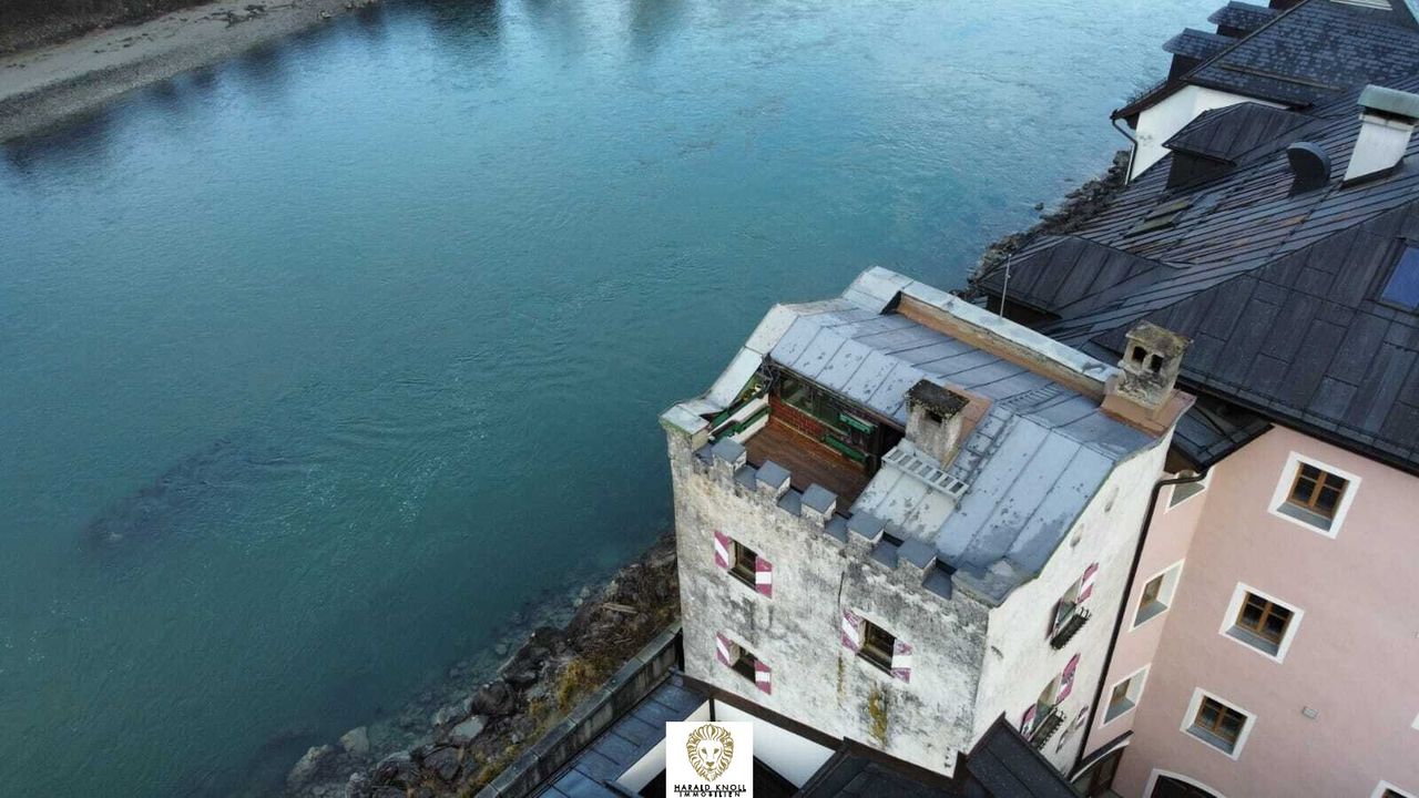 Oben am Turm befindet sich eine herrliche Aussichtsterrasse mit einem traumhaften Blick in die Tiroler-Bergwelt sowie auf den Inn. (vorbehaltlich Genehmigung wäre ein Ausbau mit einem weiteren kleinen Zimmer möglich)