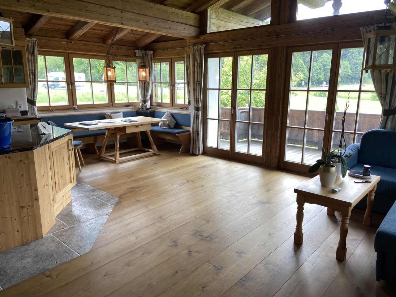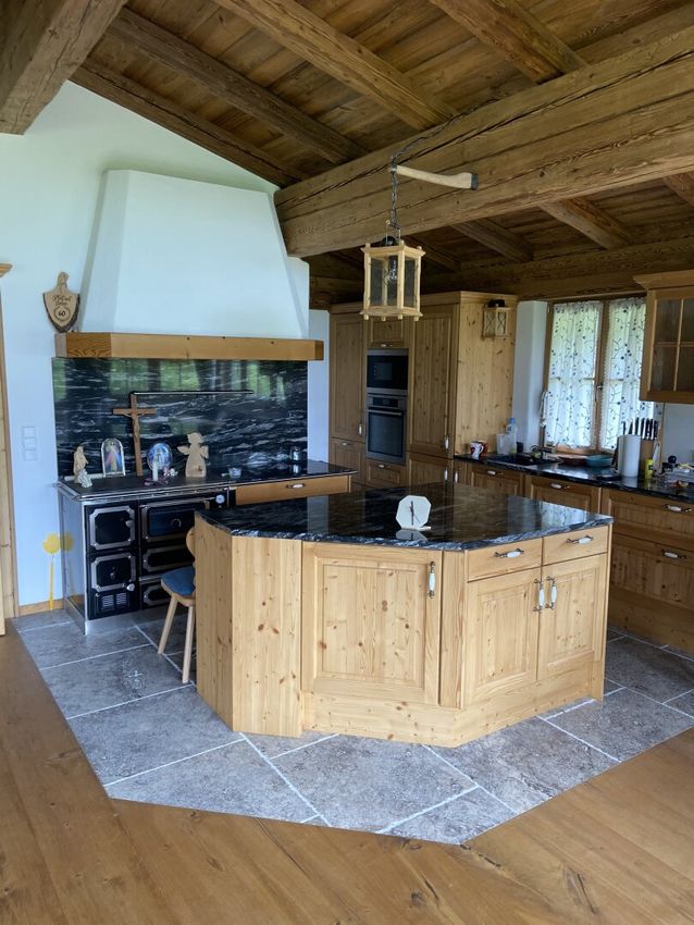 Das Chalet beeindruckt durch seine hochwertige Ausstattung und durchdachte Raumaufteilung. Edle Dielen, stilvolle Fliesen und ein eleganter Steinboden schaffen ein behagliches Ambiente. Für wohlige Wärme sorgt die Fußbodenheizung, die das gesamte Haus angenehm temperiert. Ein gemütlicher Kamin lädt zu entspannten Stunden ein und sorgt für eine heimelige Atmosphäre an kalten Wintertagen.