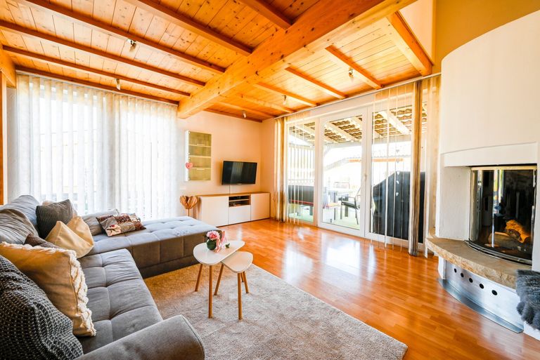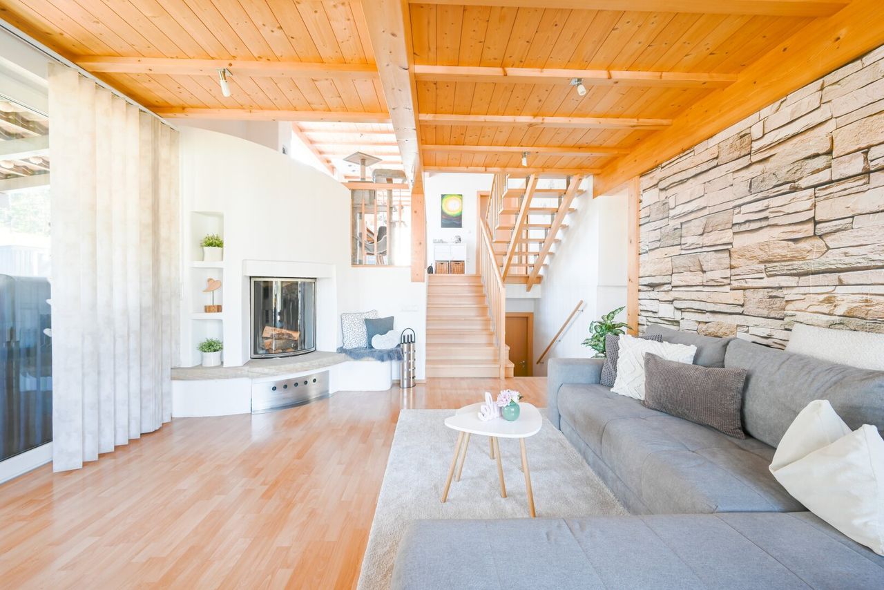 - Wärmekonzept: Ein gemütlicher Kamin und eine umweltfreundliche Erdwärme-Fußbodenheizung.