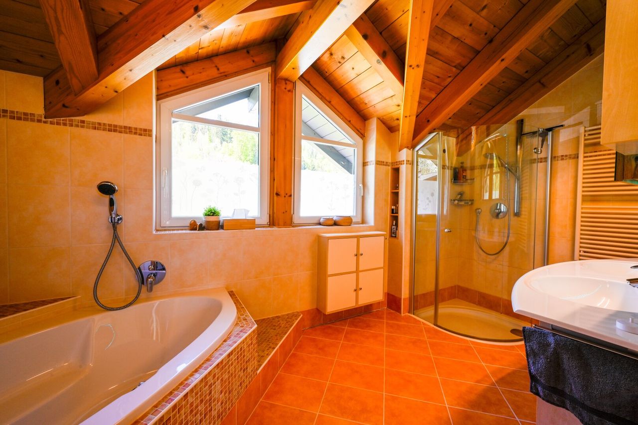 - Wellness: Eine hochwertige Wärmekabine der Firma Physiotherm sowie das helle Bad mit Badewanne und Dusche laden zum Entspannen ein.