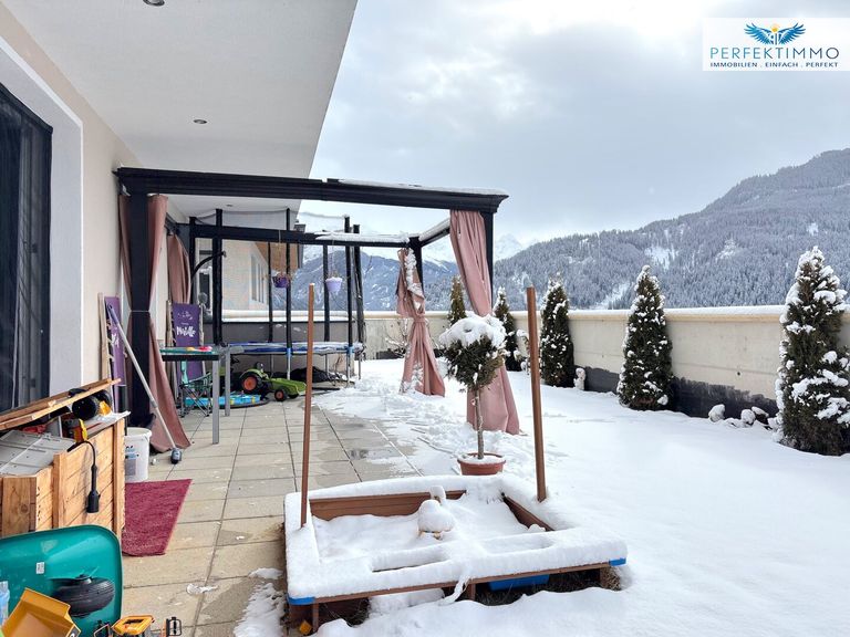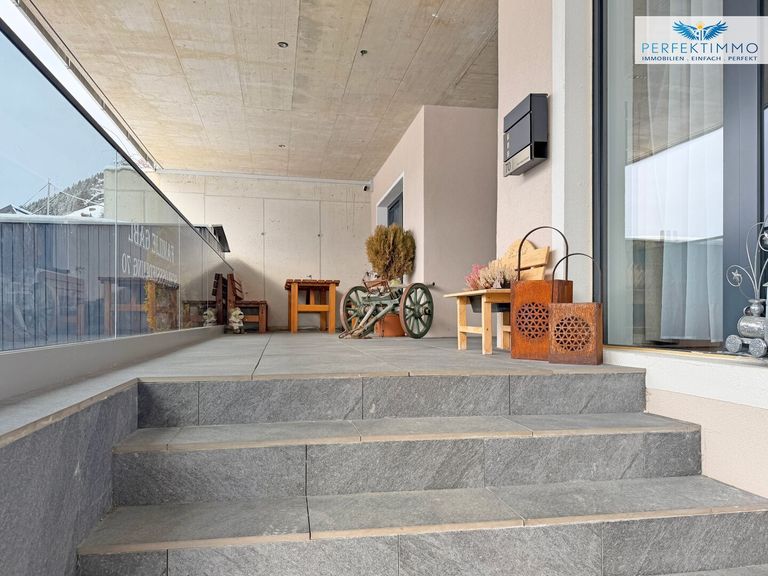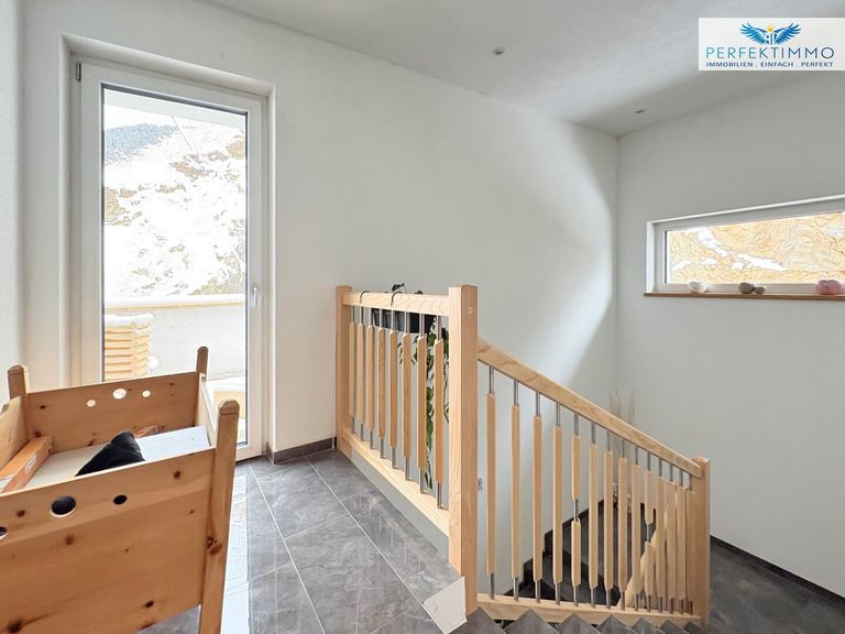 Auch im Außenbereich lässt dieses Haus keine Wünsche offen. Im Erdgeschoß lädt eine außergewöhnlich große Terrasse zum Verweilen ein, die teilweise begrünt ist und viel Platz für Spiel, Entspannung und gesellige Stunden im Freien bietet. Im Obergeschoß stehen eine weitere großzügige Terrasse mit stilvoll beleuchteter Steinwand sowie zwei Balkone zur Verfügung, von denen sich eindrucksvolle Ausblicke auf das Tal und die umliegenden Berge eröffnen. Diese vielfältigen Freiflächen erweitern den Wohnraum nach außen und bieten zu jeder Tageszeit einen passenden Rückzugsort.