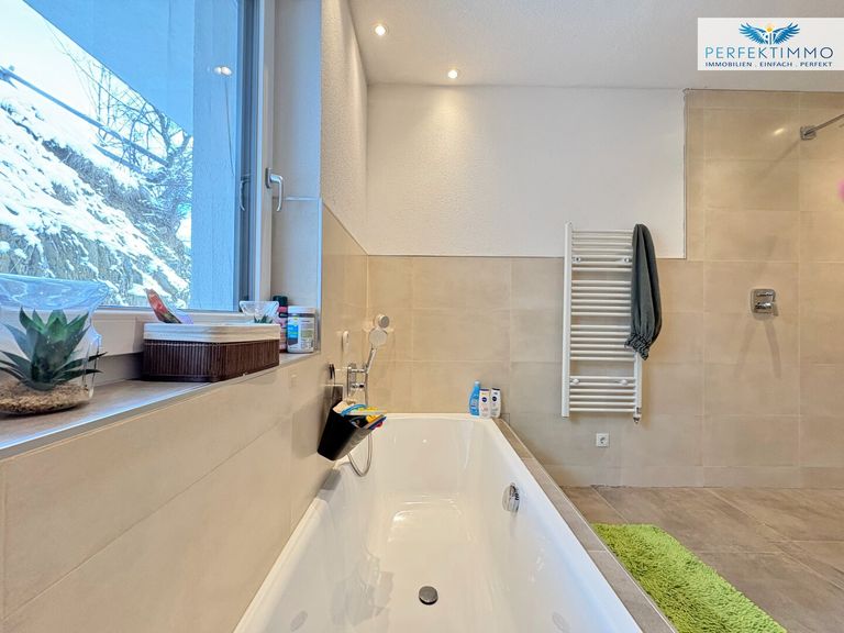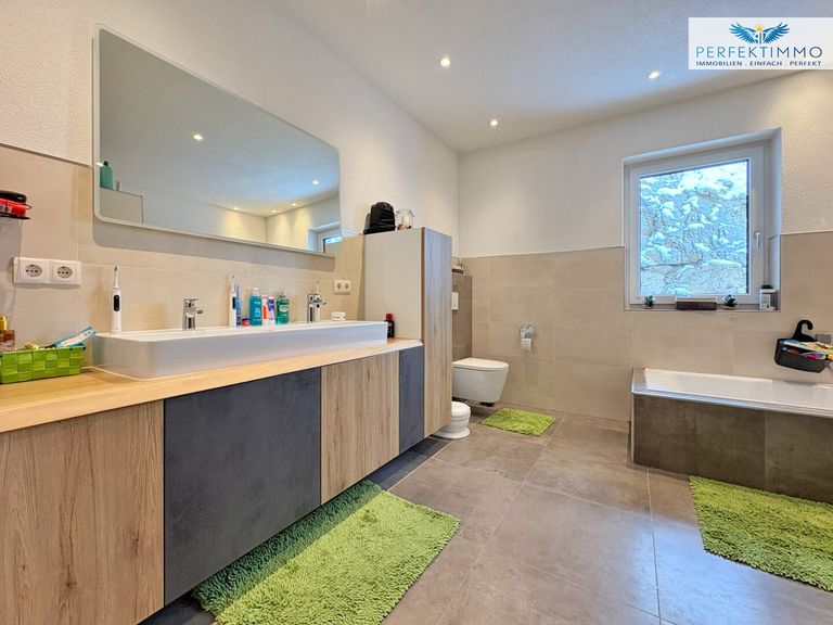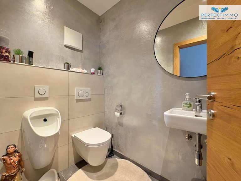 Im Innenbereich setzt sich der hohe Qualitätsanspruch konsequent fort. Hochwertige Einbauküchen bieten Funktionalität und Design auf hohem Niveau, während Tischlertüren der Firma Konrad sowie maßgefertigte, dreifach verglaste Fenster vom Tischler für ein stimmiges Gesamtbild und exzellente Dämmwerte sorgen. Ein modernes Bus-System mit Video-Türglocke bietet zusätzlichen Komfort und Sicherheit. Die Badezimmer sind zeitlos und elegant gestaltet, im Haupthaus steht darüber hinaus ein separates Gäste-WC mit Toilette und Pissoir zur Verfügung, was den Alltag mit Familie und Besuch besonders angenehm macht. WLAN ist selbstverständlich im gesamten Haus installiert.