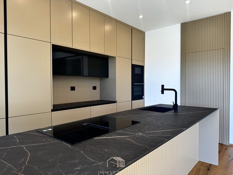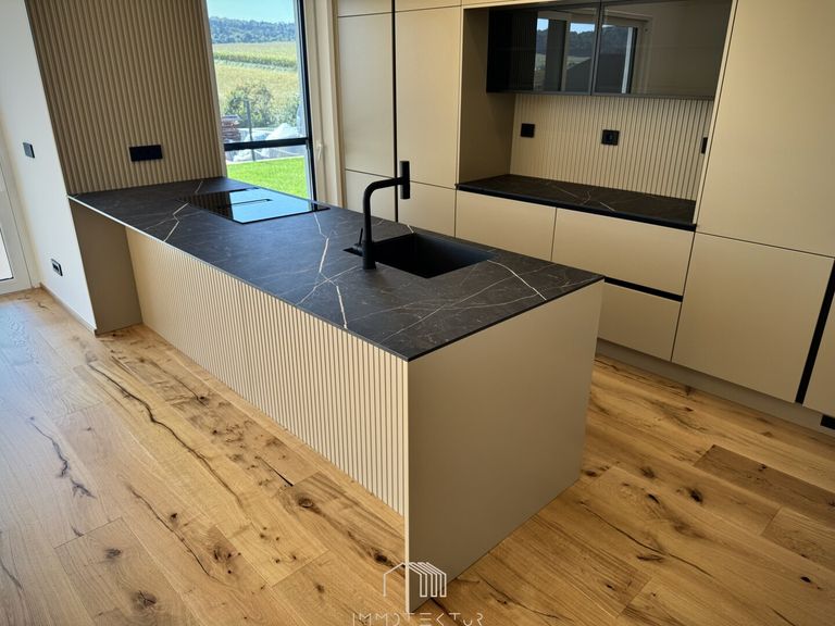 Die im Kaufpreis enthaltene maßgefertigte Tischlerküche ist mit Marken-E-Geräten ausgestattet und rundet den modernen Wohnbereich perfekt ab.