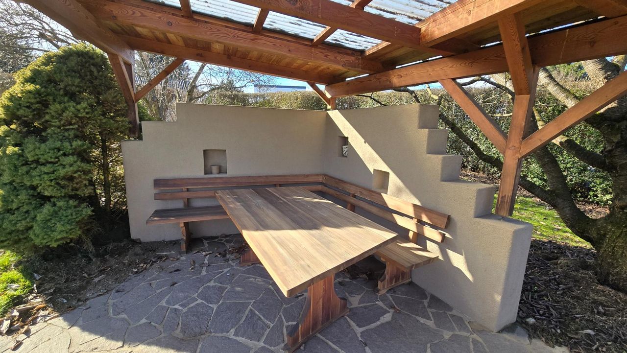 Der Garten bietet Platz für Erholung, Spiel und Gestaltung – und wird durch eine liebevoll gestaltete, kleine Laube ergänzt, die sich ideal als Rückzugsort an warmen Tagen, für Gartenfeste oder ruhige Stunden im Grünen eignet.