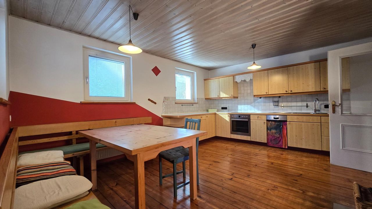 Im Erdgeschoss empfängt eine wohnliche Essküche mit Schwedenofen, ein Ort an dem sich Alltag und Geselligkeit ganz selbstverständlich verbinden.