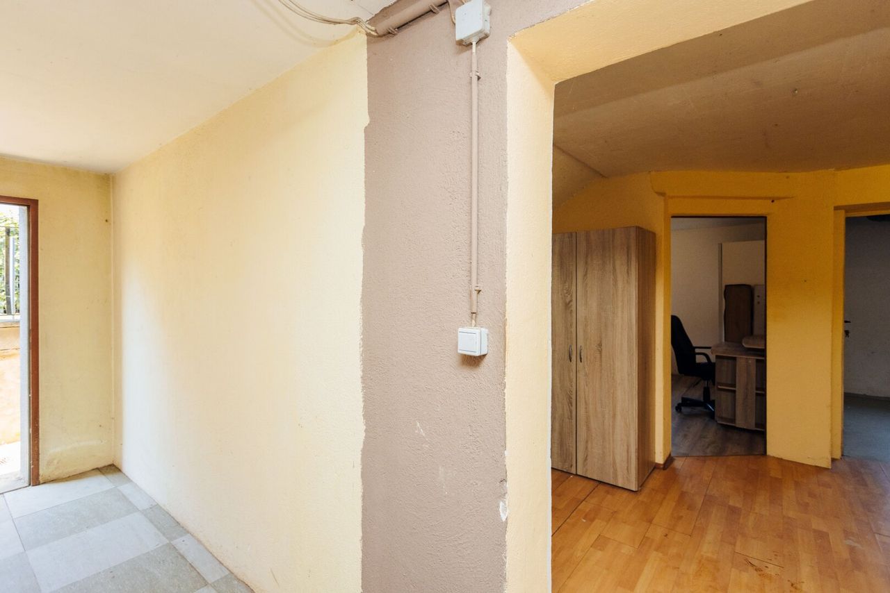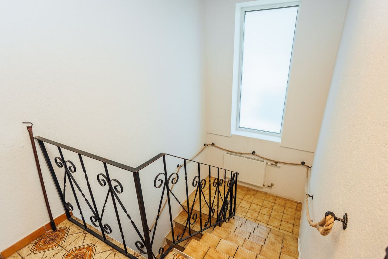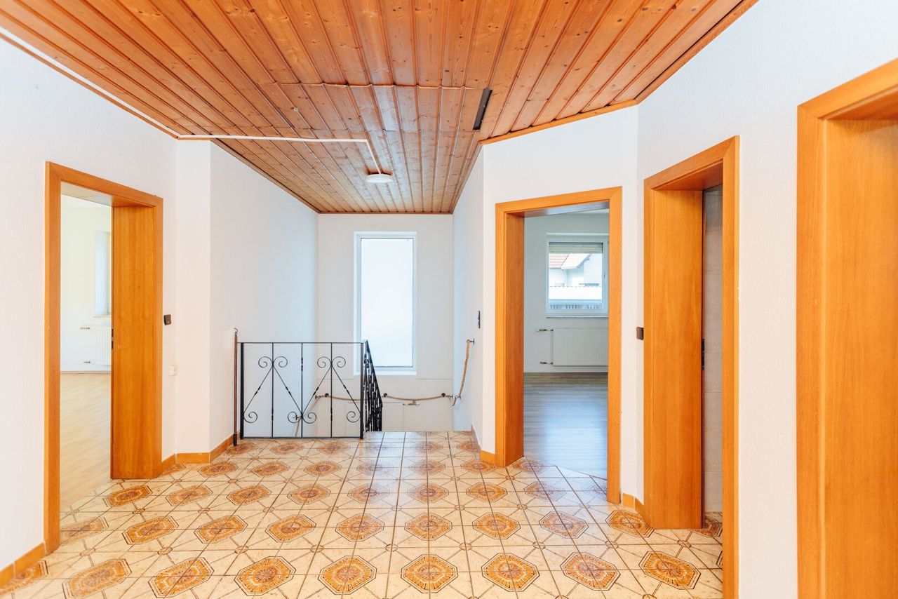 Im Erdgeschoss empfängt Sie ein großzügiger, offen gestalteter Vorraum. Von hier aus gelangen Sie in das neu renovierte Badezimmer, die separate Toilette sowie in ein Schlafzimmer.