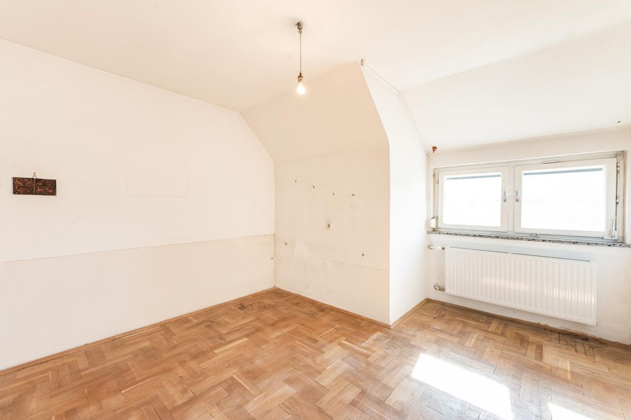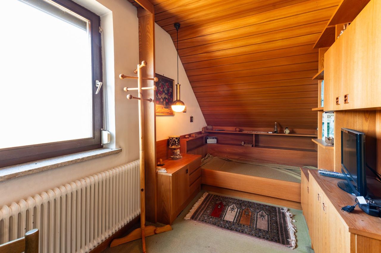Das ausgebaute Dachgeschoss bietet weitere ca. 63 m² Wohnfläche und umfasst drei Zimmer, ein WC sowie einen Raum im Zubau des Hauses, der zusätzlichen Wohnkomfort und einen schönen Blick ins Grüne bietet.