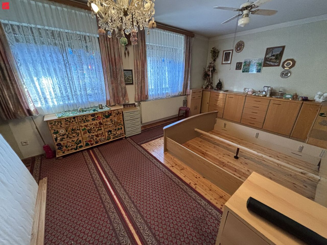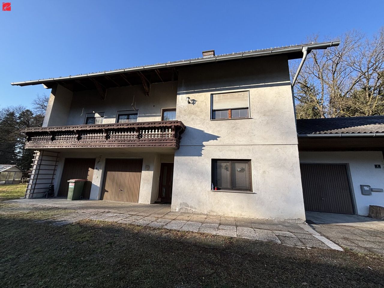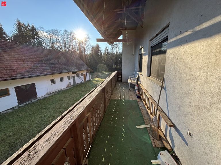 Raumaufteilung: Im Erdgeschoß befindet sich ein Vorraum, der Heizraum, eine von zwei Küchen im Haus, ein Abstellraum, ein Bad mit Dusche und Waschtisch, sowie ein WC. Die Doppelgarage, ein Holzlager und ein Pelletslager, sowie eine weitere Garage sind ebenfalls ebenerdig begehbar. Im Obergeschoß befinden sich eine Diele, ein Bad mit Eckbadewanne und Waschtisch, WC separat, drei getrennt begehbare Zimmer, ein Abstellraum und die zweite geräumige Küche mit Essbereich. Der großzügige und sonnige Balkon ist über den Vorraum begehbar. Zum Haus gehört ein Wirtschaftsgebäude (teilweise in Ziegelmassiv, teilweise Holzriegelwandbauweise), ein Holzschuppen, sowie eine Scheune mit Stallungen für Kleintiere. Ein alter Traktor ist im Haus vorhanden und kann auf Wunsch abgelöst werden.