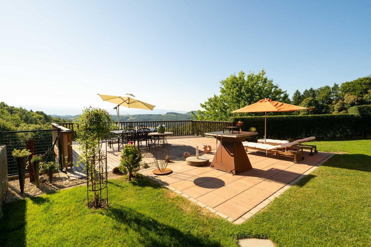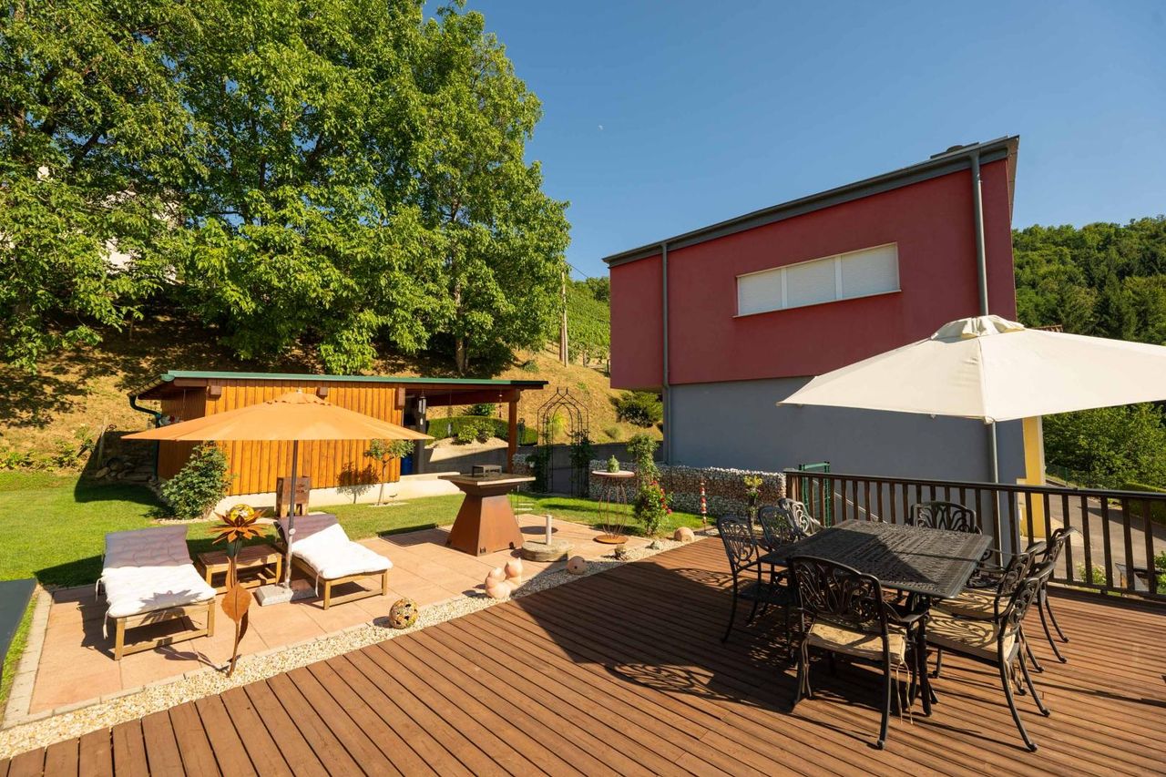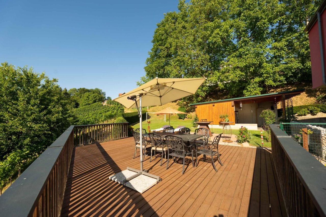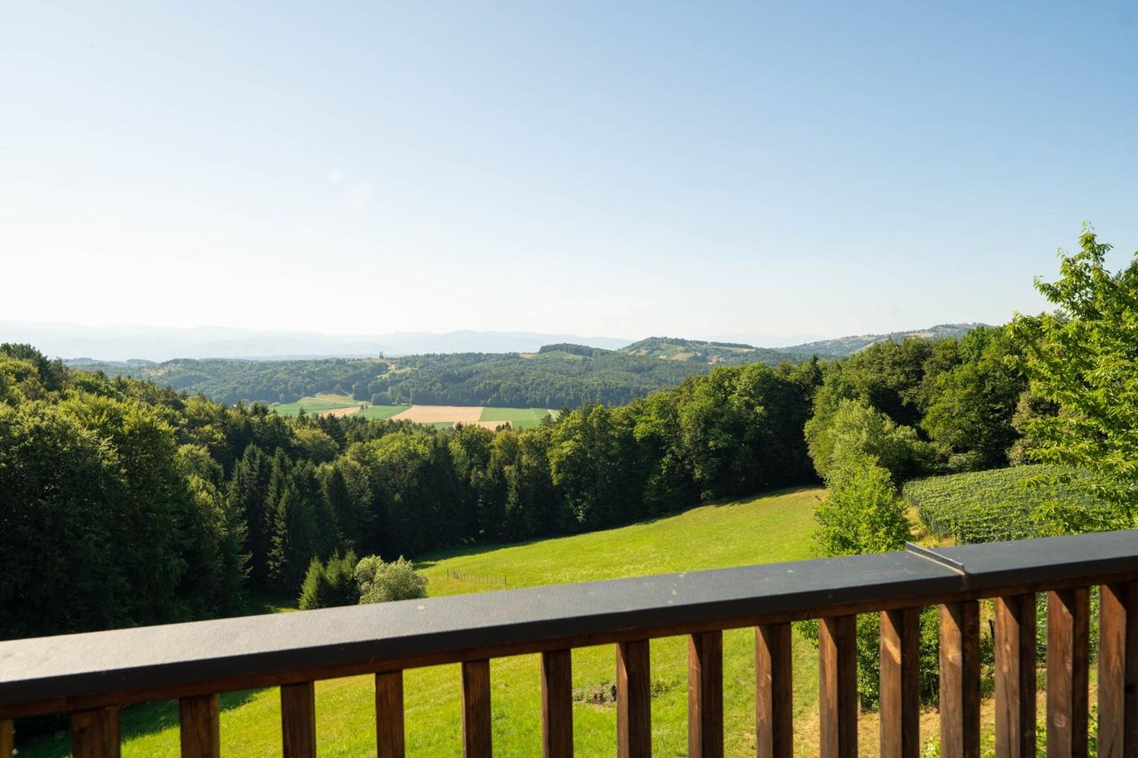 Die großzügige Terrasse mit unvergleichlichem Panoramablick über die umliegenden Weinberge und das südsteirische Hügelland – ein Ort der Ruhe, Inspiration und unvergesslicher Sonnenuntergänge.