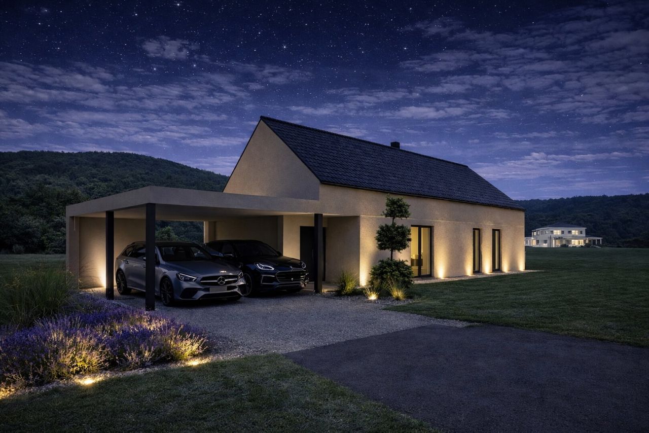 Das großzügige Carport mit rund 47 m² schützt Ihre Fahrzeuge zuverlässig vor Witterungseinflüssen und verfügt über einen Starkstromanschluss. Zusätzlich wurde hier ein Kellerersatzraum mit etwa 11 m² eingeplant, der praktischen Stauraum bietet.
