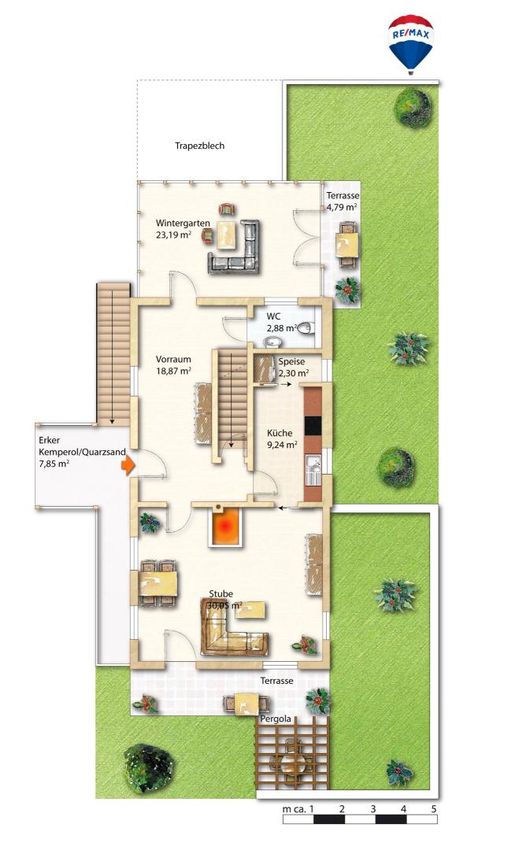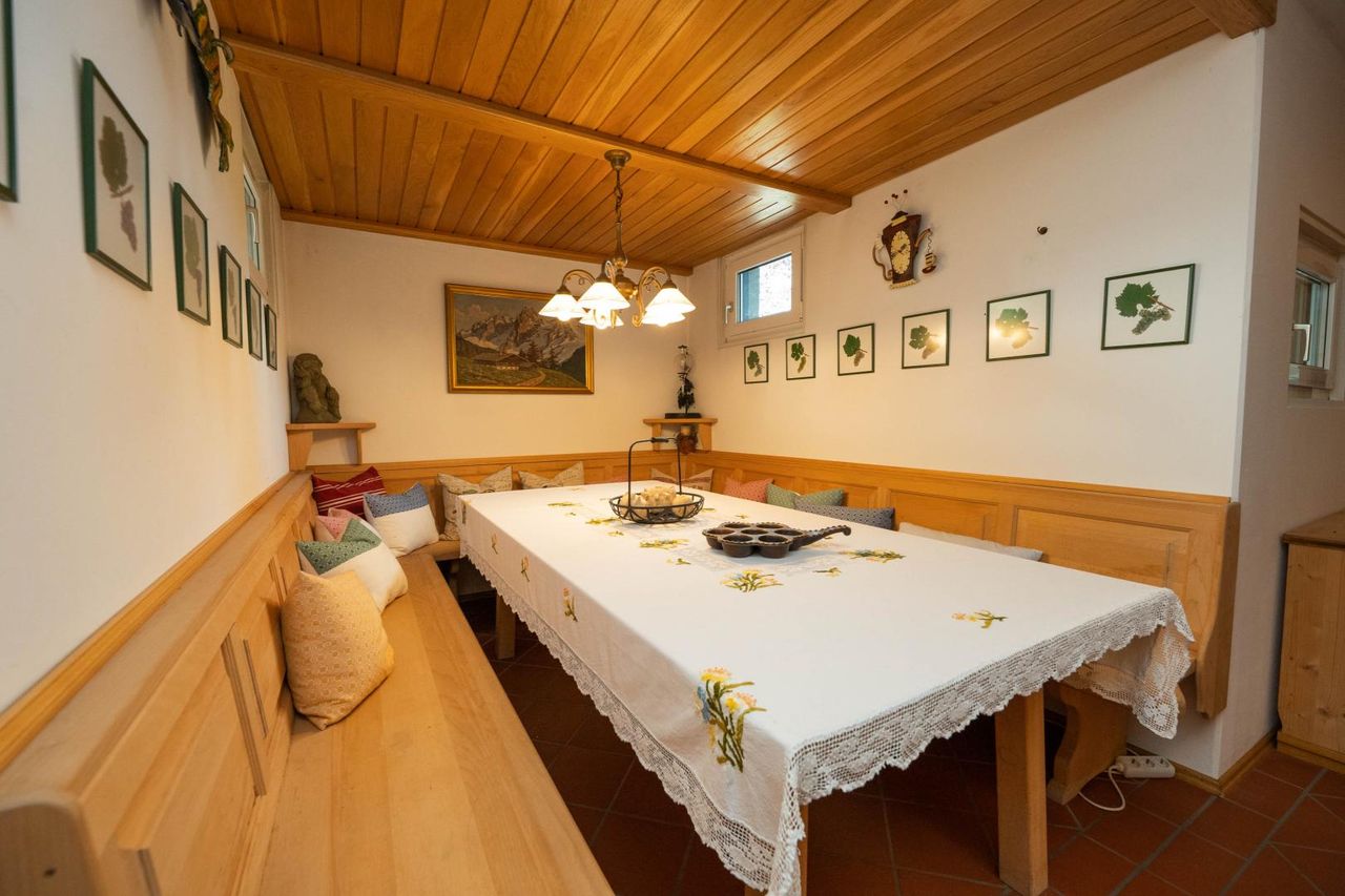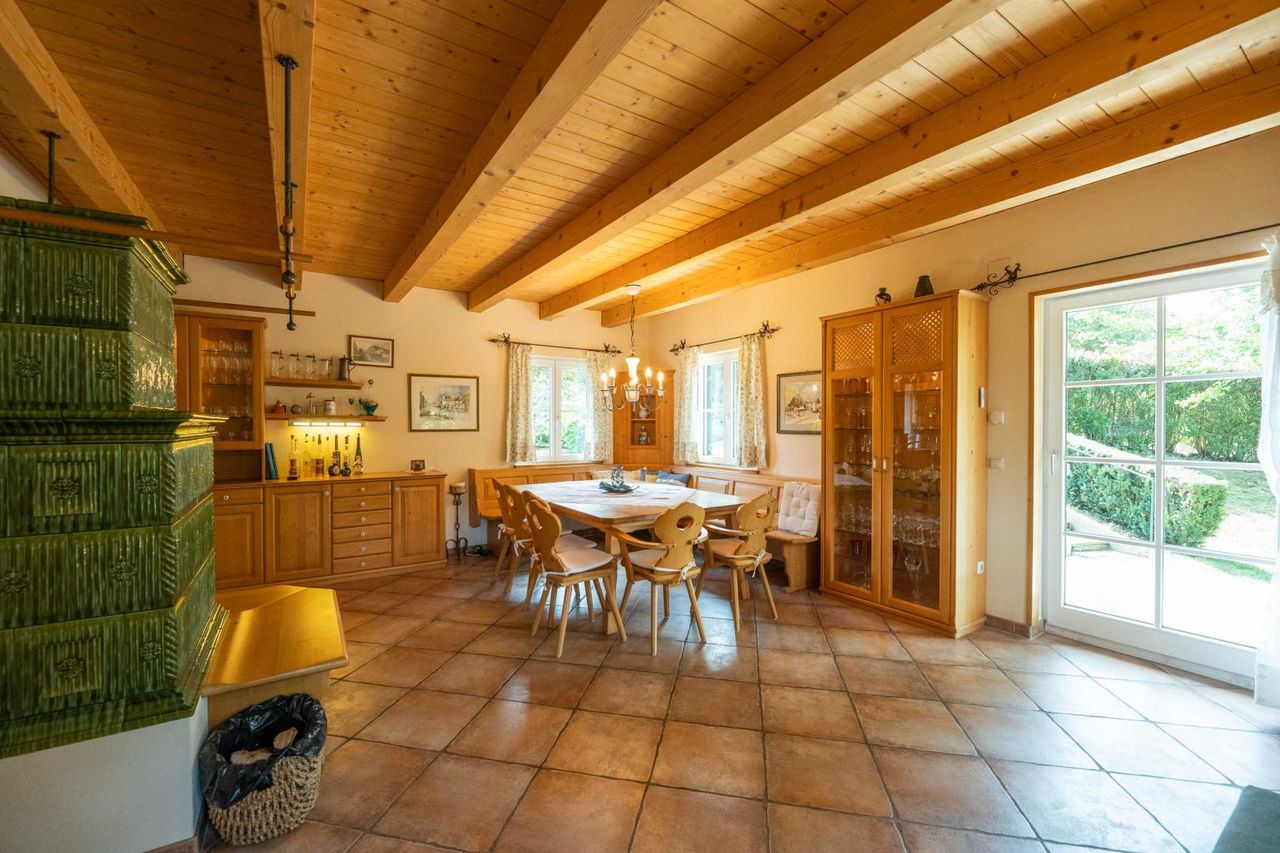 Das Erdgeschoss bietet neben Küche mit Speis und Gäste-WC vor allem das rund 30 m² große Wohn-Esszimmer mit traditionellem Kachelofen.