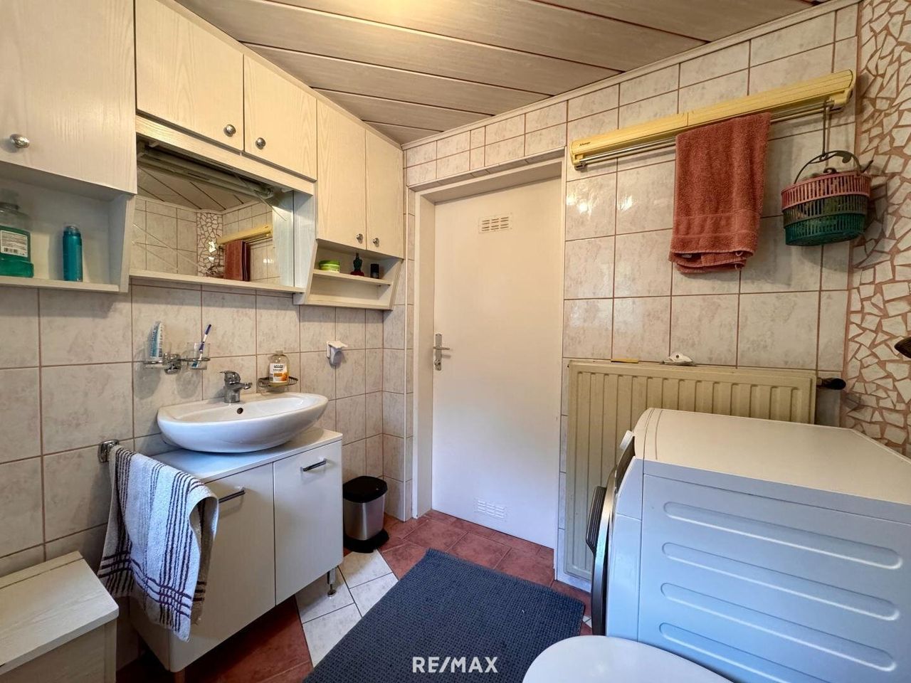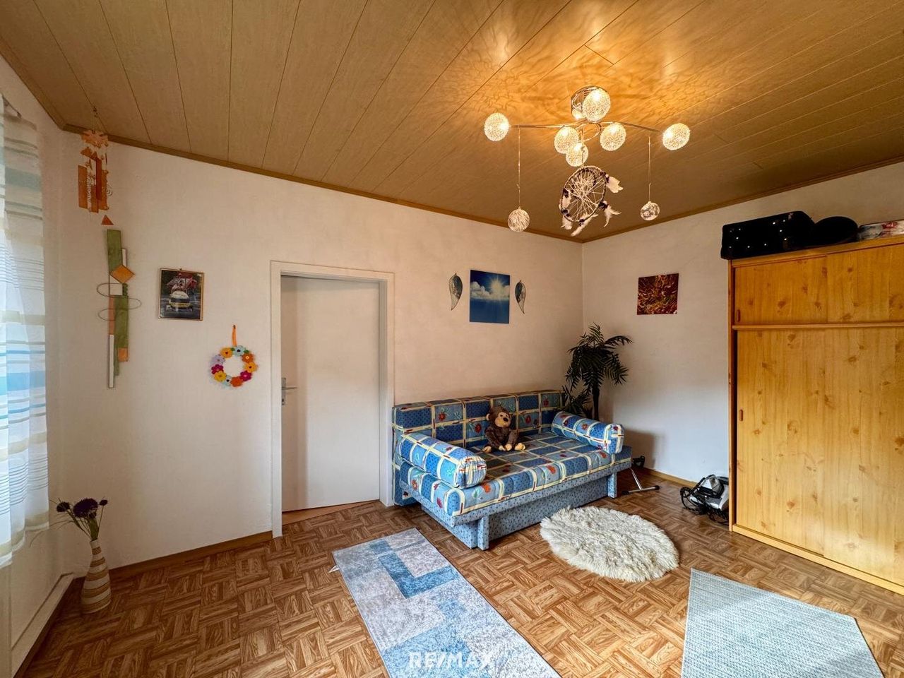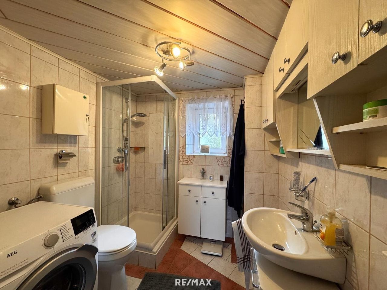 Auf dem Grundstück befindet sich ein Wohnhaus mit einer Wohnfläche von ca. 114 m², aufgeteilt in zwei Wohneinheiten. Im Erdgeschoss befindet sich eine kleine Wohnung mit Küche, einem Zimmer und Bad. Die zweite Wohneinheit im Obergeschoss ist über eine Außentreppe separat zugänglich und besteht aus Küche, Wohnzimmer, zwei Zimmer sowie Bad und Abstellraum. Das Gebäude ist nicht unterkellert. Im hinteren Bereich, in den Hang gebaut, befindet sich jedoch ein Kellerraum, in dem sich die Gastherme sowie der Warmwasserboiler befinden.