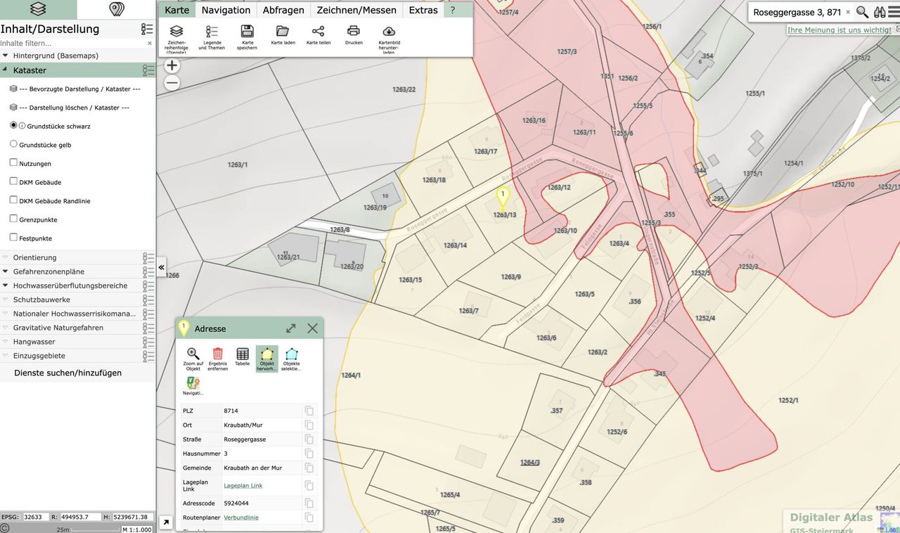 Das Grundstück befindet sich in der Gelben bzw. teilweise in der Roten Gefahrenzone.
