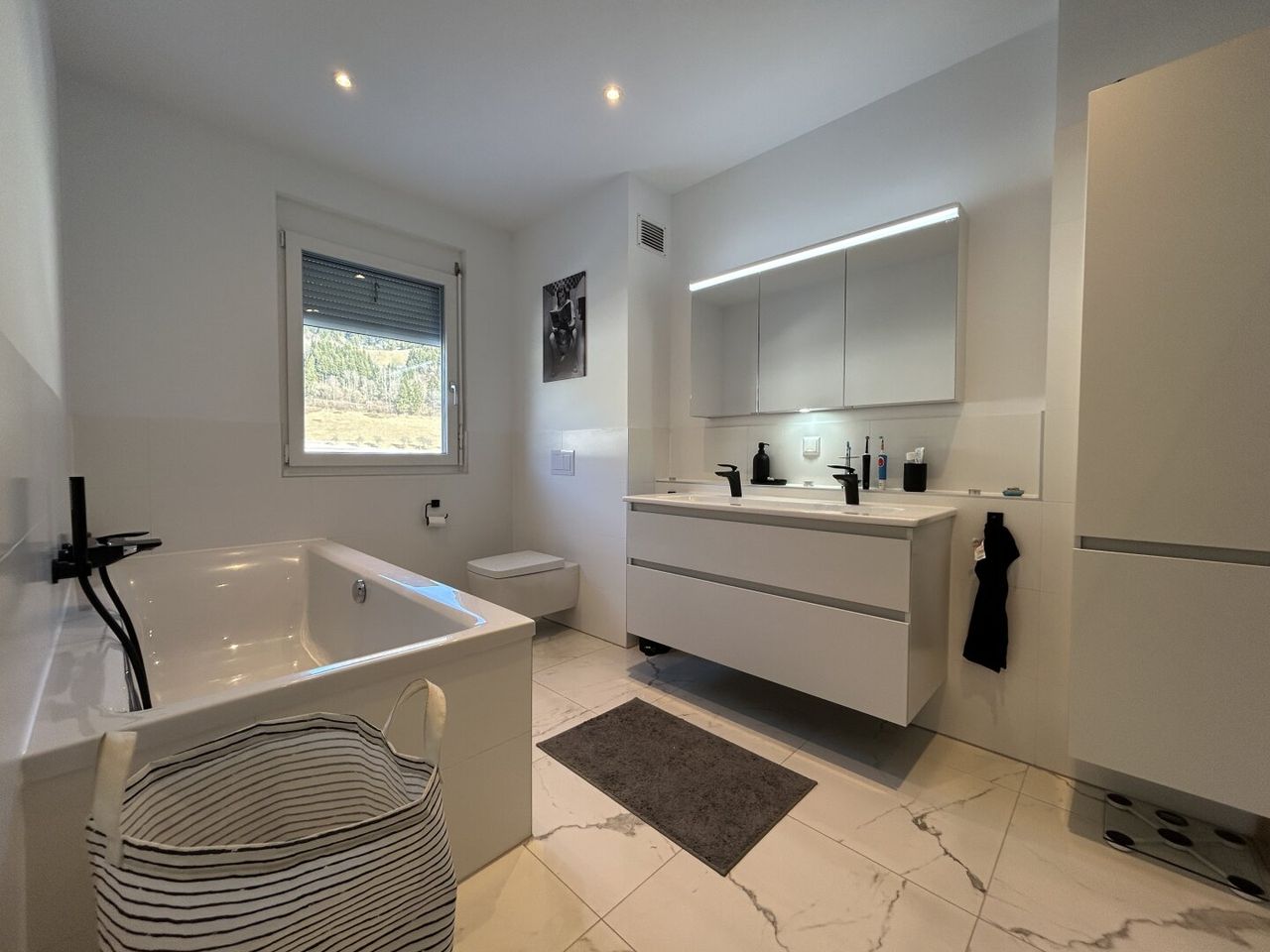 Badezimmer: Modern ausgestattet mit Fenster, Badewanne, Dusche und Doppelwaschbecken – alles für maximalen Komfort.