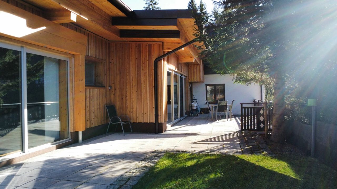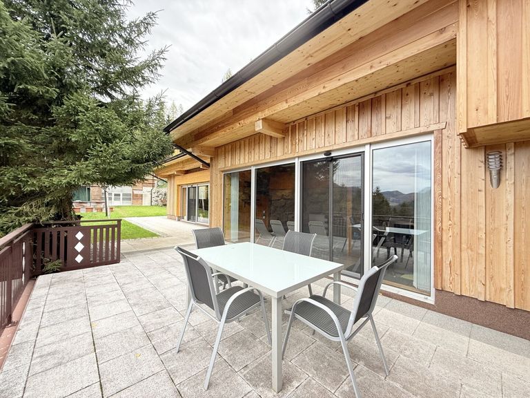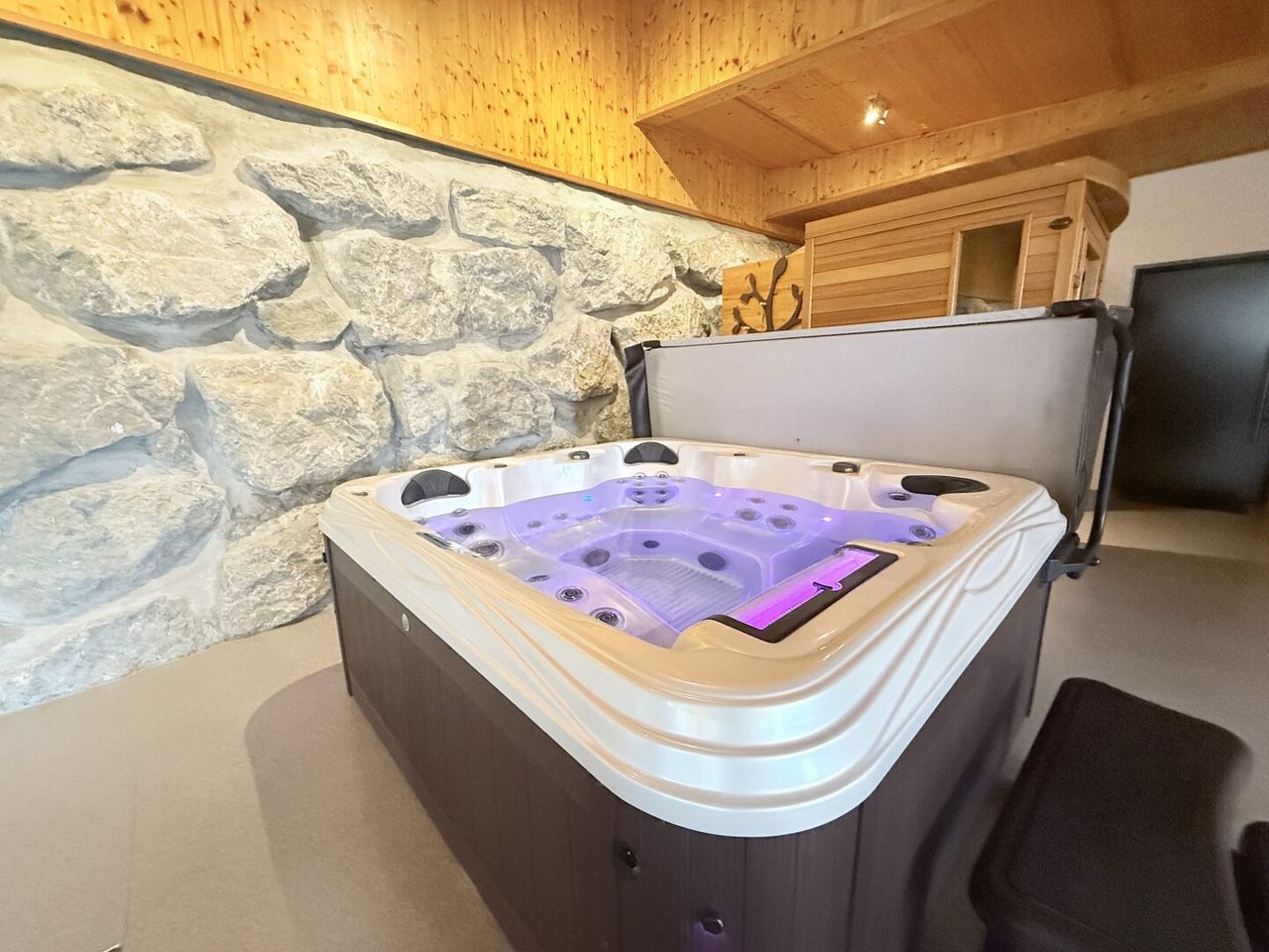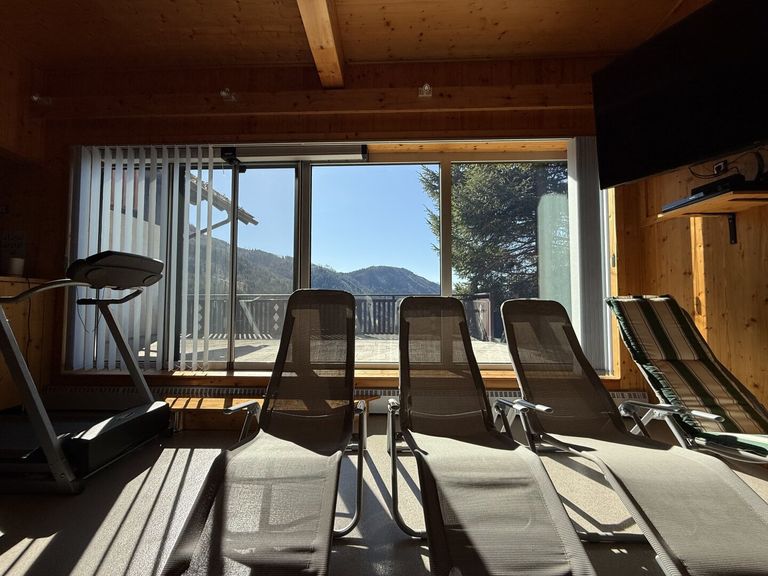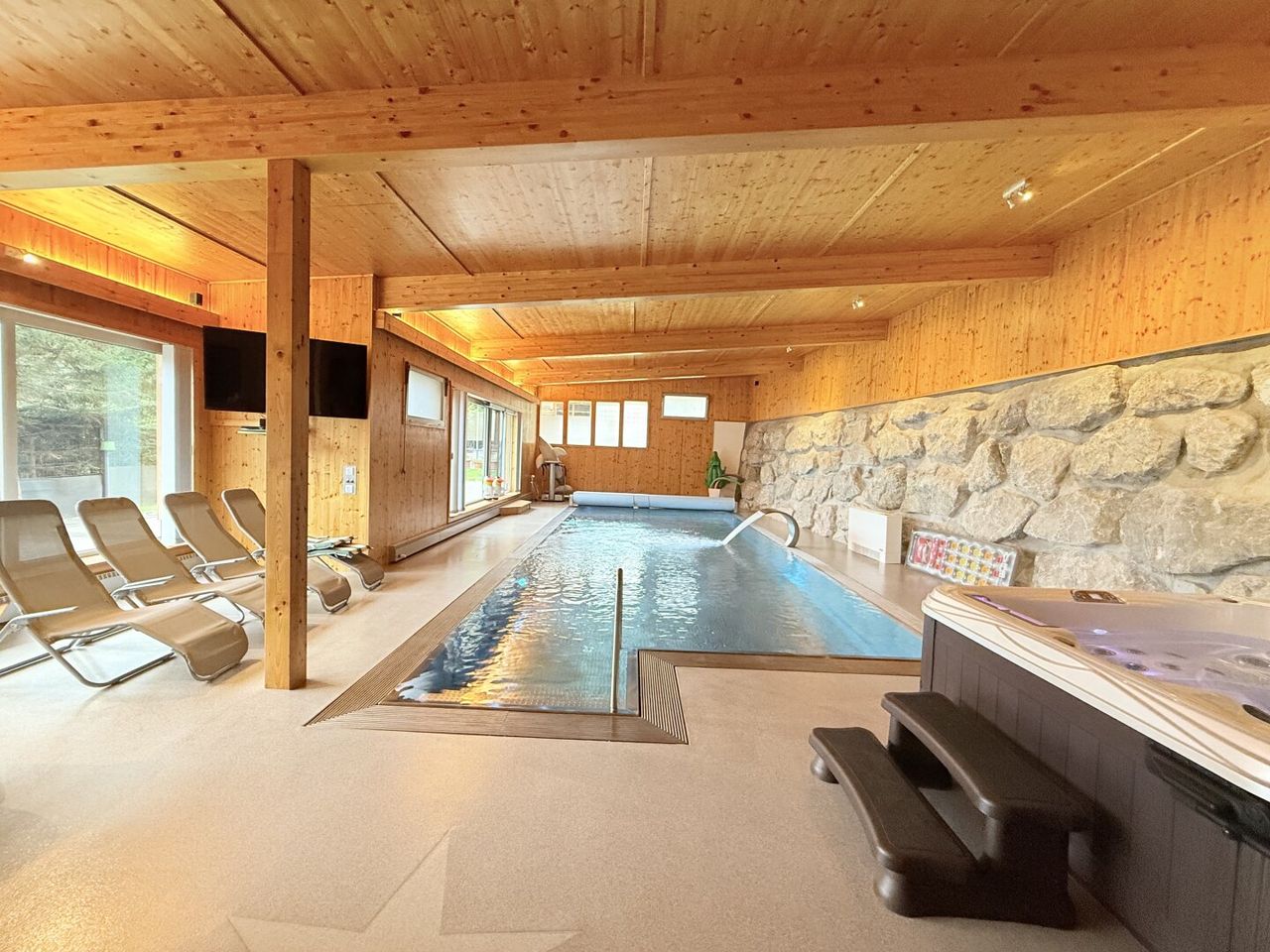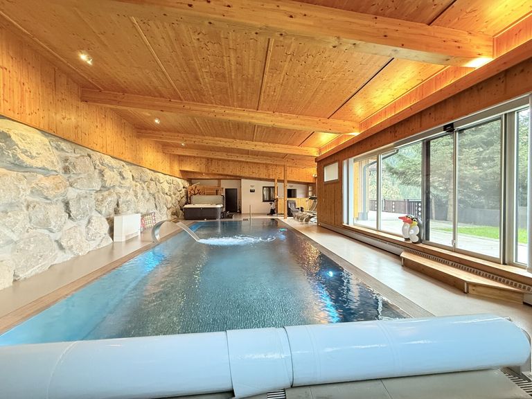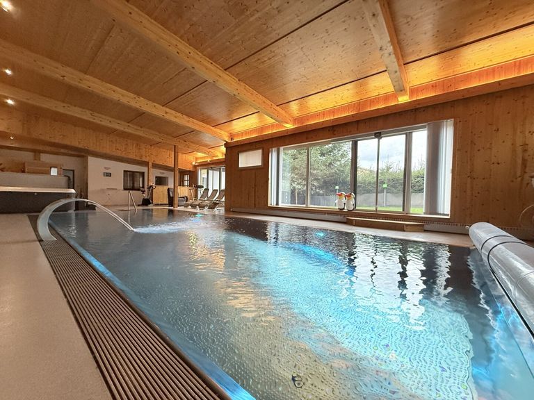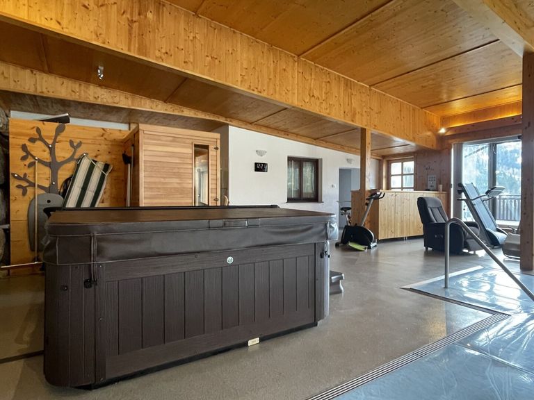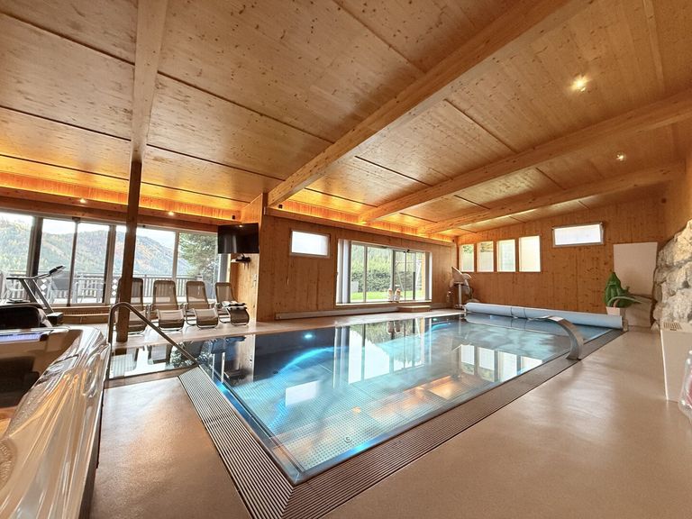 Ein besonderes Highlight ist der 157 m² große Wellness-Bereich im Erdgeschoss, ausgestattet mit Fußbodenheizung, einem Edelstahl-Hallenbad (10m x 4m), einem Jacuzzi, Dusche, WC und großzügigen Liegeflächen. Der Wellness-Bereich eignet sich hervorragend für Familien mit Kindern, da er absperrbar ist und die Terrasse mit der angrenzenden Grünanlage im Westen sicher eingezäunt ist. Große Fensterflächen ermöglichen einen atemberaubenden Blick auf die Berge und bieten Zugang zur uneinsehbaren Terrasse und zum uneinsehbaren Grünbereich.