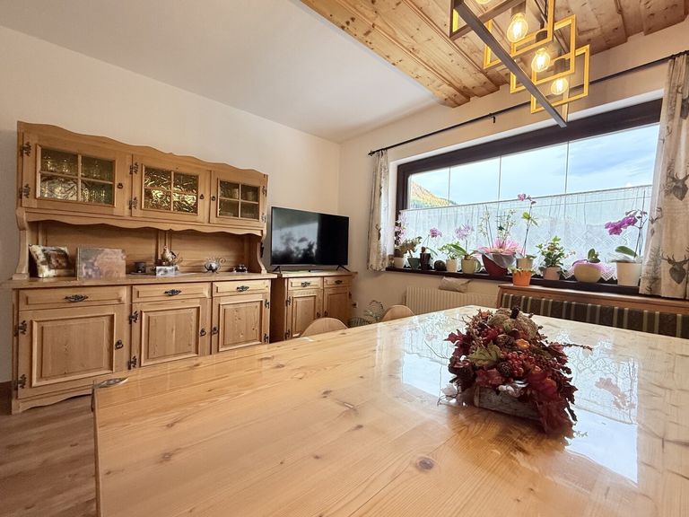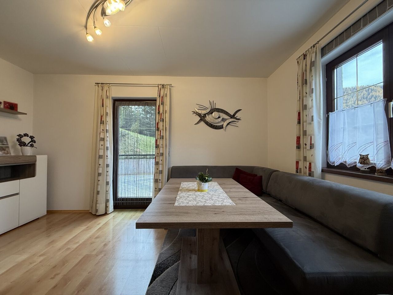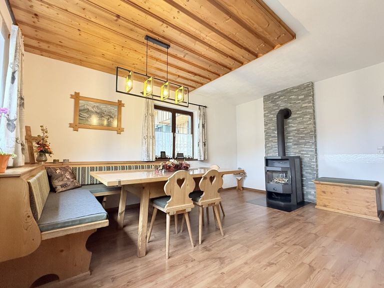Eine einladende Küche, eine gemütliche Bauernstube mit einem Kaminofen, das Esszimmer mit Zugang zur uneinsehbaren Terrasse, zwei weitere Zimmer, ein Badezimmer mit Badewanne und Dusche und Fenster, ein WC und ein Vorraum.