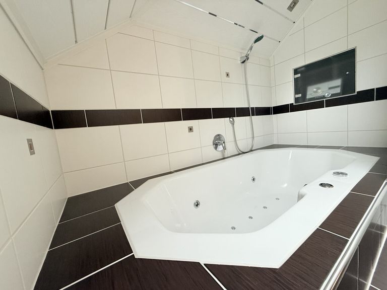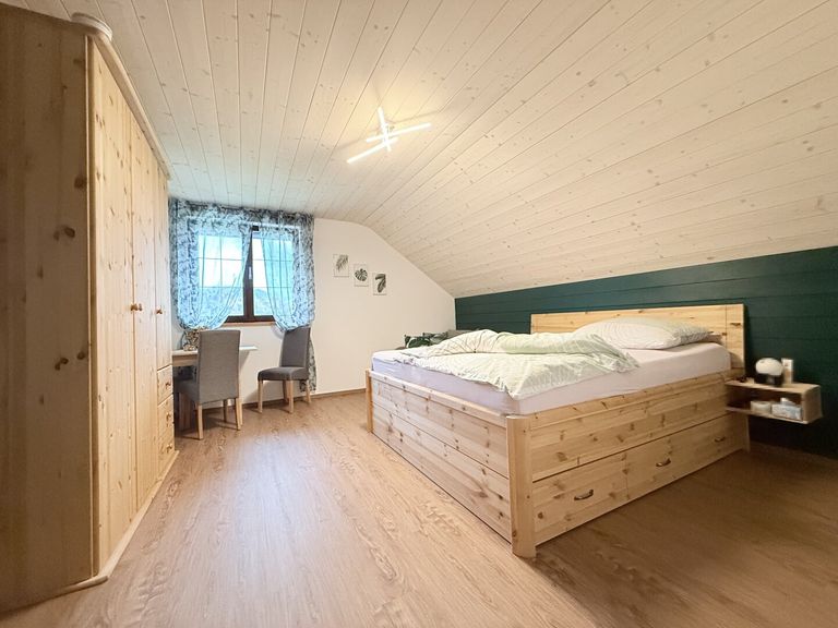 Hier befinden sich 3 Zimmer, ein weiteres Badezimmer mit Badewanne, Dusche und Fenster, ein WC und ein Vorraum.