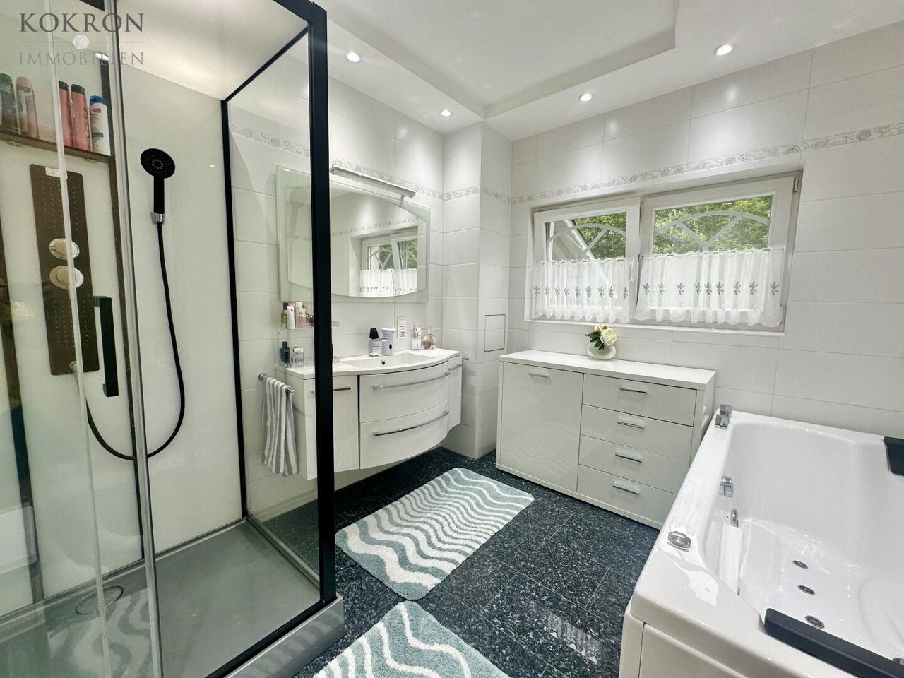- Bad Obergeschoss mit Dusche, Whirlpool, Waschbecken, Handtuchtrockner und Fenster