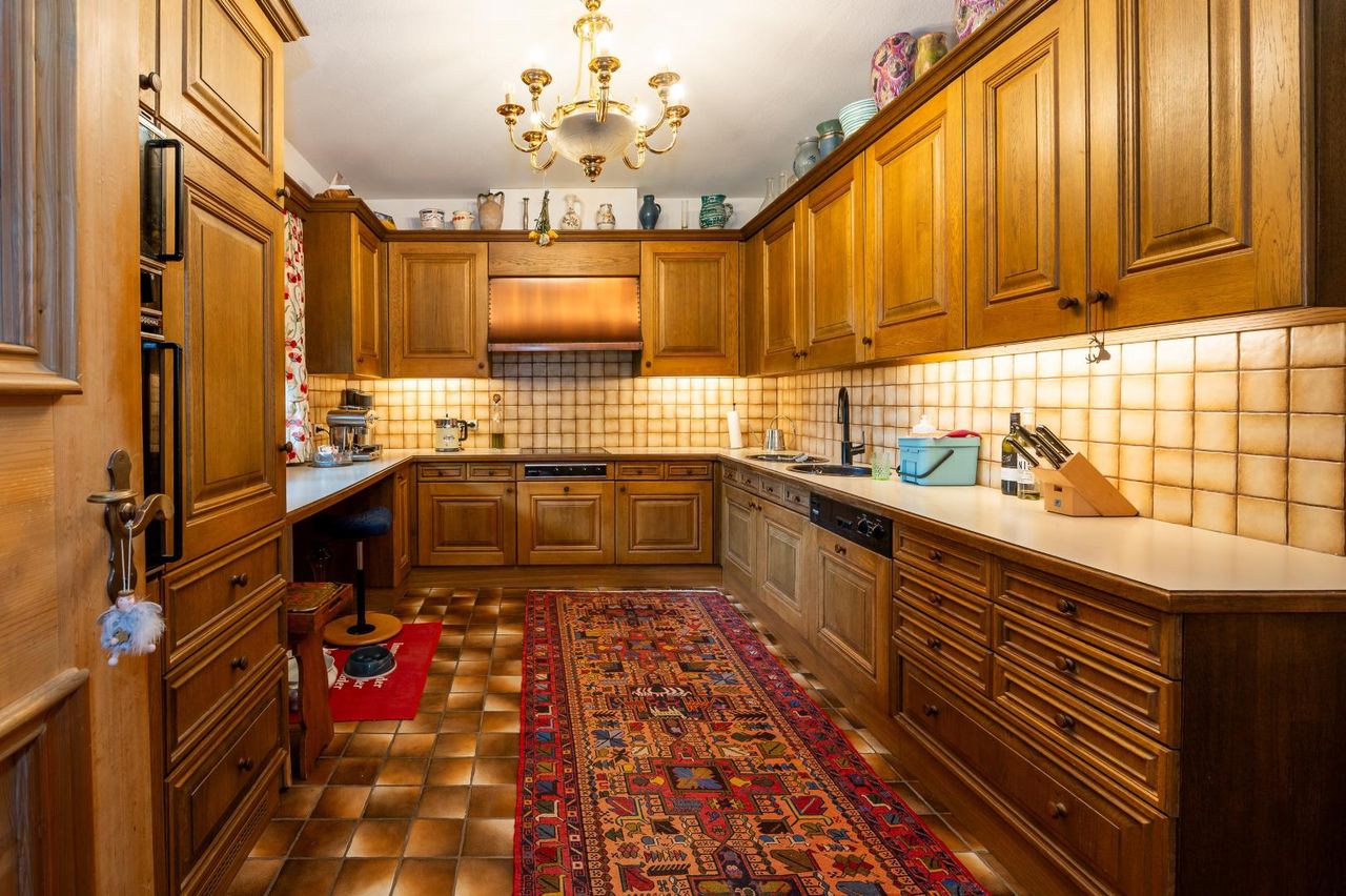Die Küche ist solide in Vollholz ausgeführt, mit klassischen Fliesen und zeitloser Anmutung.