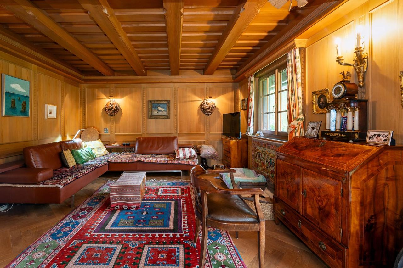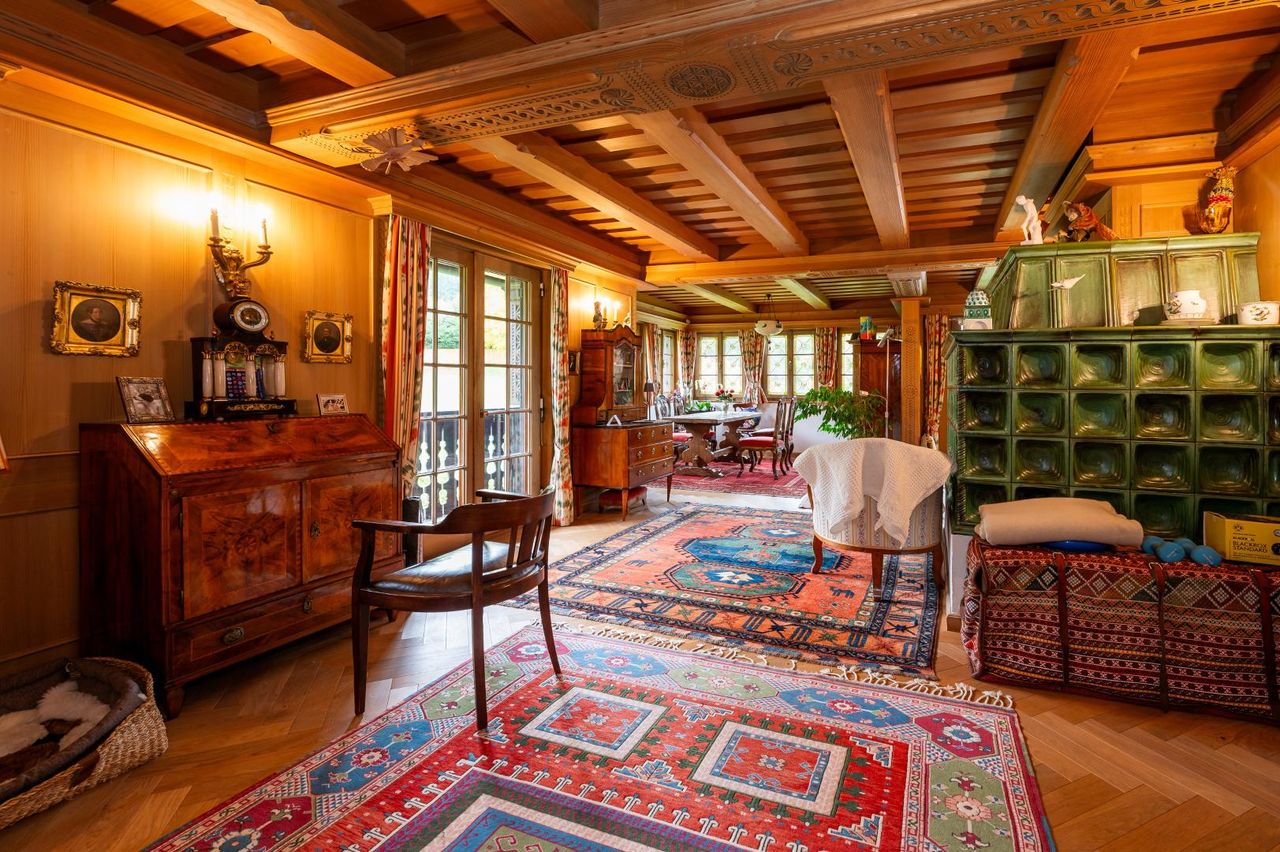 Im Obergeschoß eröffnet sich der repräsentative Wohnbereich – ein lichtdurchfluteter Raum mit umlaufendem Balkon, Panoramablick über das Tal und handwerklich perfekter Holzvertäfelung. Der große Essbereich mit Erker und verzierten Fenstern bietet Platz für gesellige Runden in stilvoller Atmosphäre.