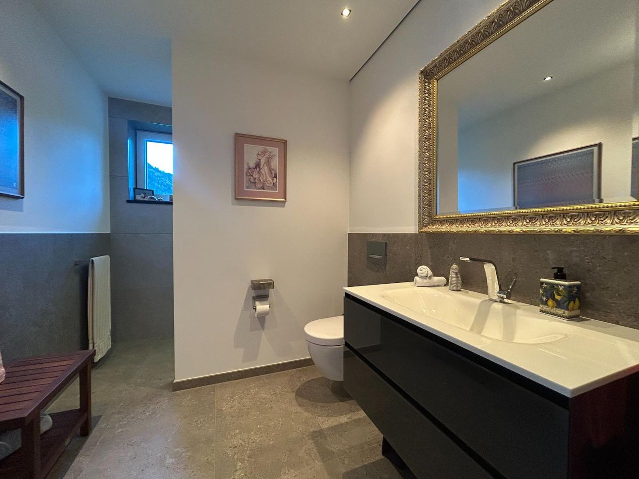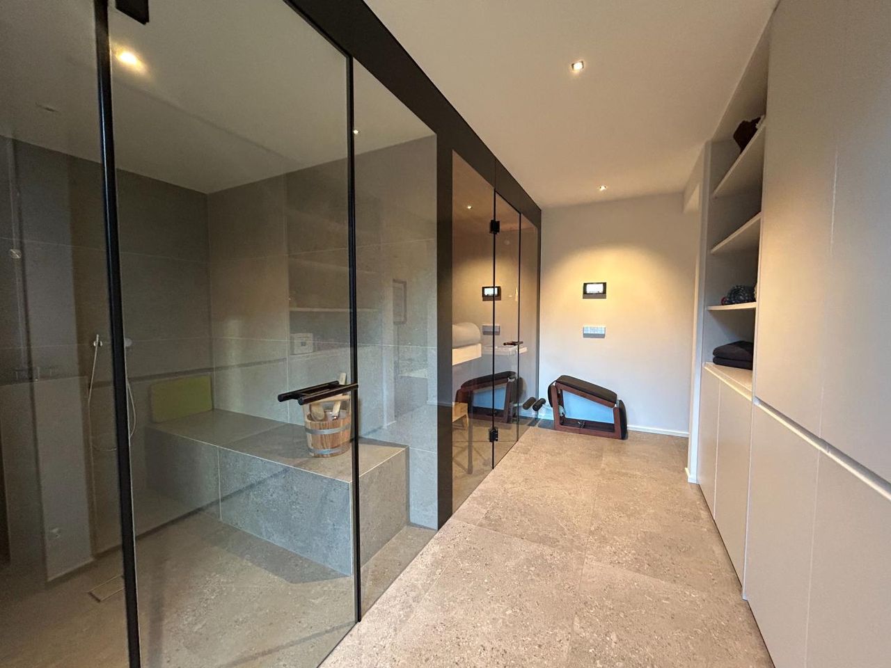 Upstairs, a beautiful gallery leads to three rooms – one with a walk-in closet, and two with direct access to the spacious balcony. The private spa area includes a sauna-sanarium, steam bath, large shower area, bathroom, and a separate WC with bidet.