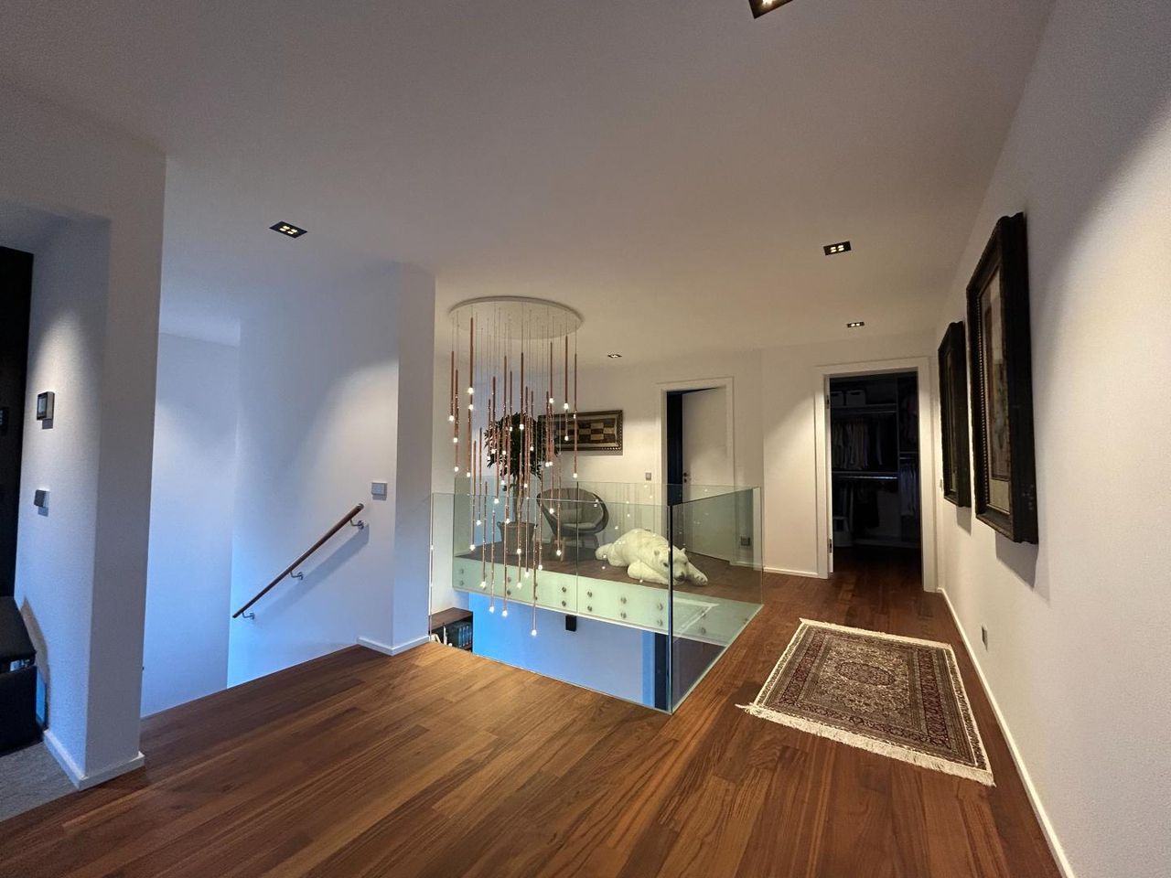 Im Obergeschoss befindet sich eine wunderschöne Galerie, 3 Zimmer, 1 Zimmer davon mit Ankleideraum und 2 Zimmer mit Ausgang auf den großen Balkon, eigener Saunabereich mit Sauna-Sanarium und Dampfbad, großer Duschbereich, Badezimmer, eigener Raum für WC und Bidet.