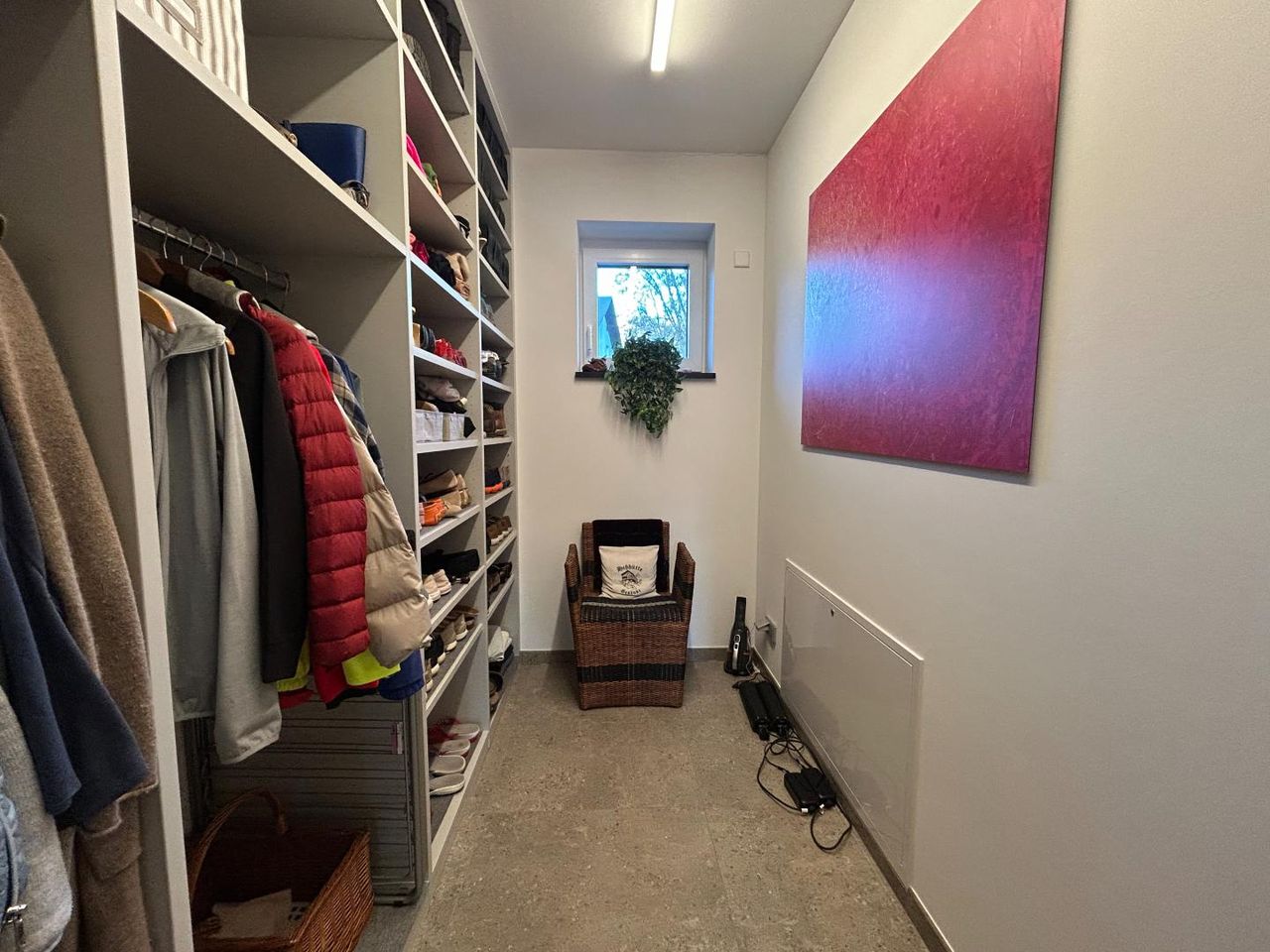 On this level, you’ll also find one bedroom, a modern bathroom with a walk-in shower, WC, urinal, a cozy reading corner, storage room, utility room, cloakroom, and access to the double garage and technical room (for the pool, heating system, photovoltaic system, and central vacuum cleaner).