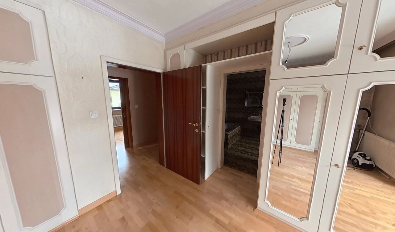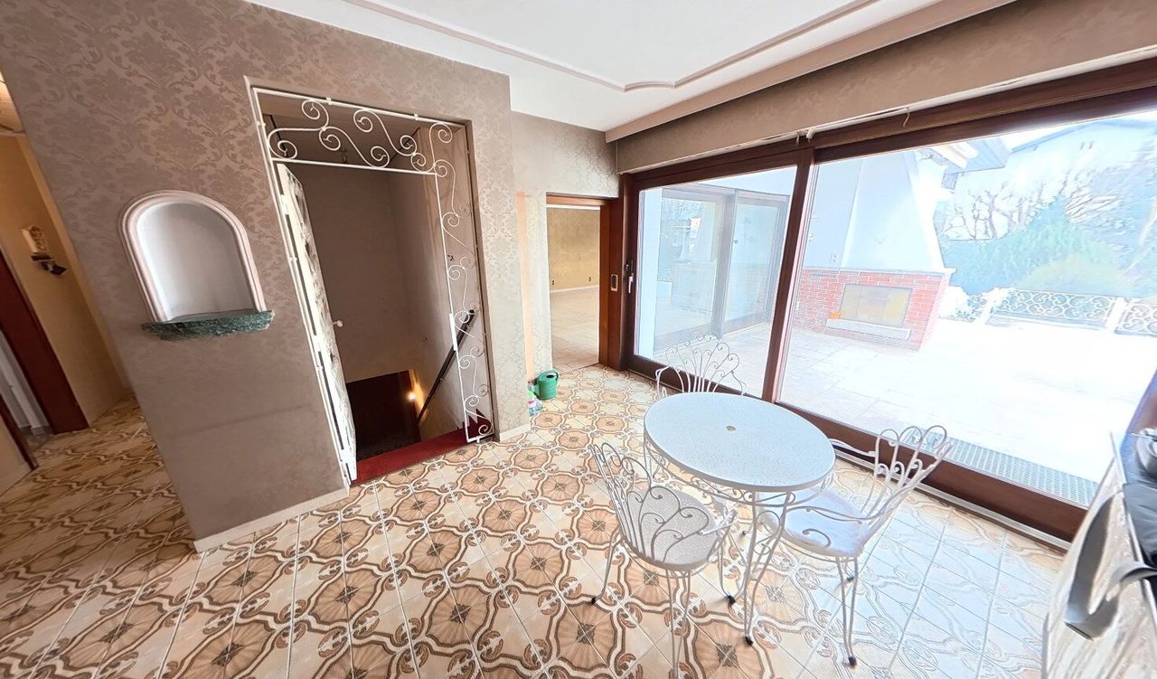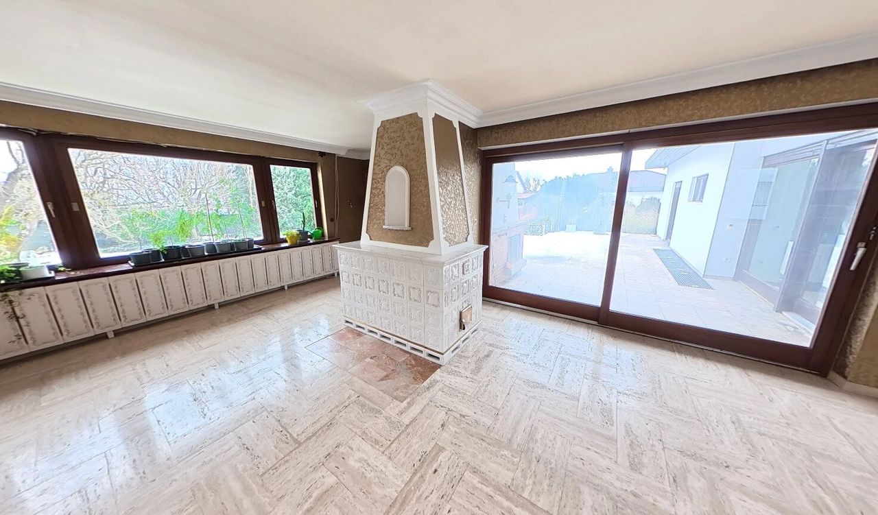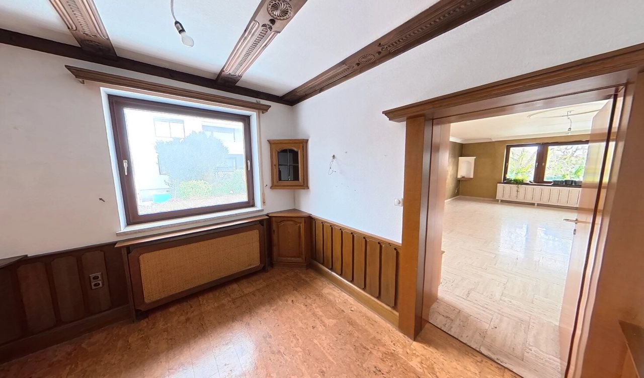 Der aktuell mit Bodenplatte bedeckte Indoor-Pool im voll ausgebauten, bewohnbaren Keller lädt ganzjährig zum Entspannen ein. Bei Bedarf lässt sich die Platte samt Trägern entfernen und eine Wohlfühloase samt Pool im eigenen Haus erschaffen. Mit sieben Wohnräumen, einer Garage mit Stellplätzen, Stauraum und Werkstatt sowie einem begehbaren Dachboden bietet das Haus vielseitige Möglichkeiten.