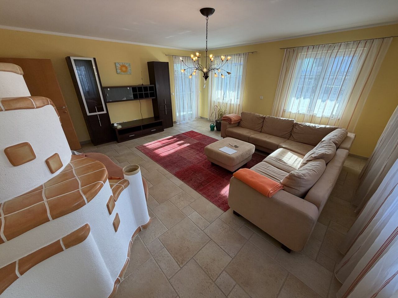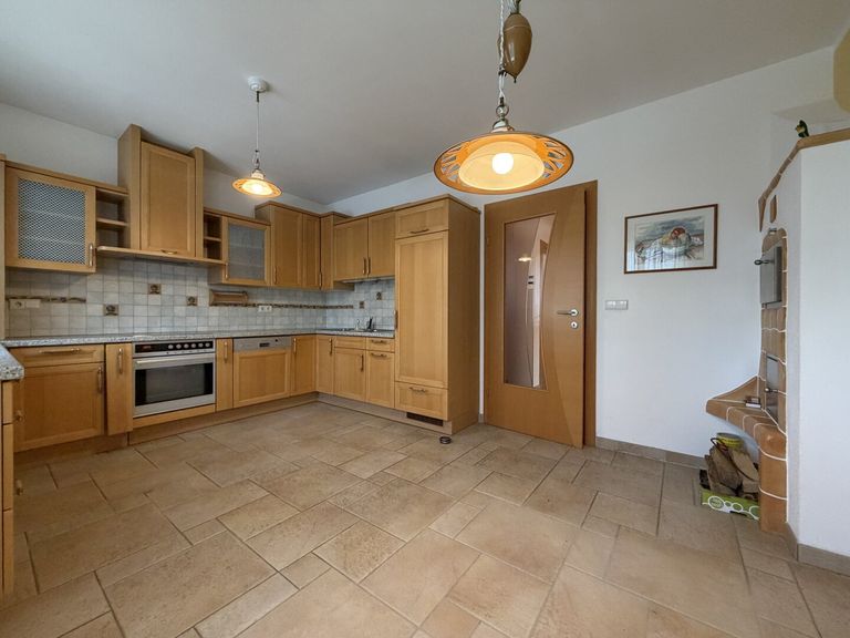 - gemütlicher Kachelofen im Wohnbereich und Küche
