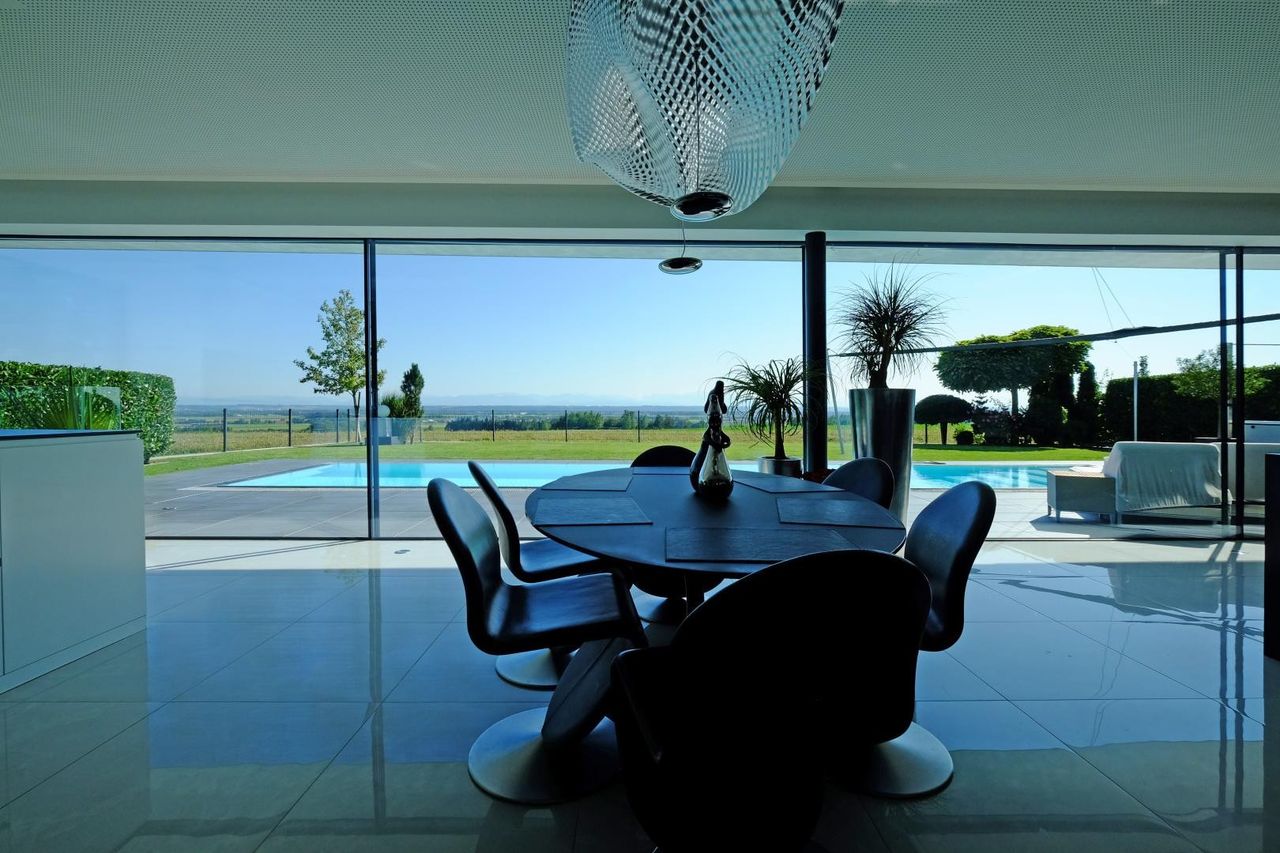 Einmal eingetreten, kann man bereits erahnen, welchen Luxus dieses Domizil zu bieten hat. Durch die große Glastüre erhascht man hier bereits den Blick ins Interieur und in den Garten.
