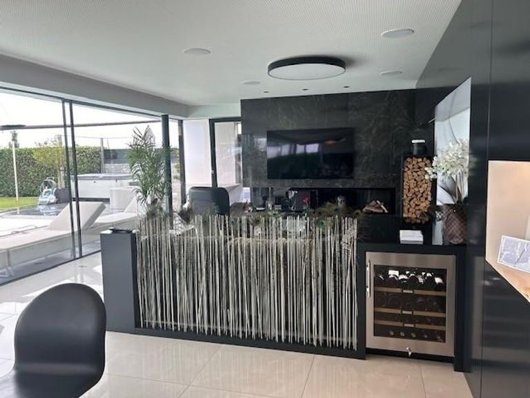Im gesamten Innen- u. Außenbereich dominieren die Farben Schwarz und Weiß. Auf Design wurde bei der Einrichtung höchstes Augenmerk gelegt. Mit der perfekt durchdachten Lichttechnik wurden wunderbare Akzente gesetzt. Der große, offene Wohn-Essbereich mit einer Küche, die höchsten Ansprüchen gerecht wird, lädt zum Kochen, Essen und Entspannen ein.Waschküche im EG