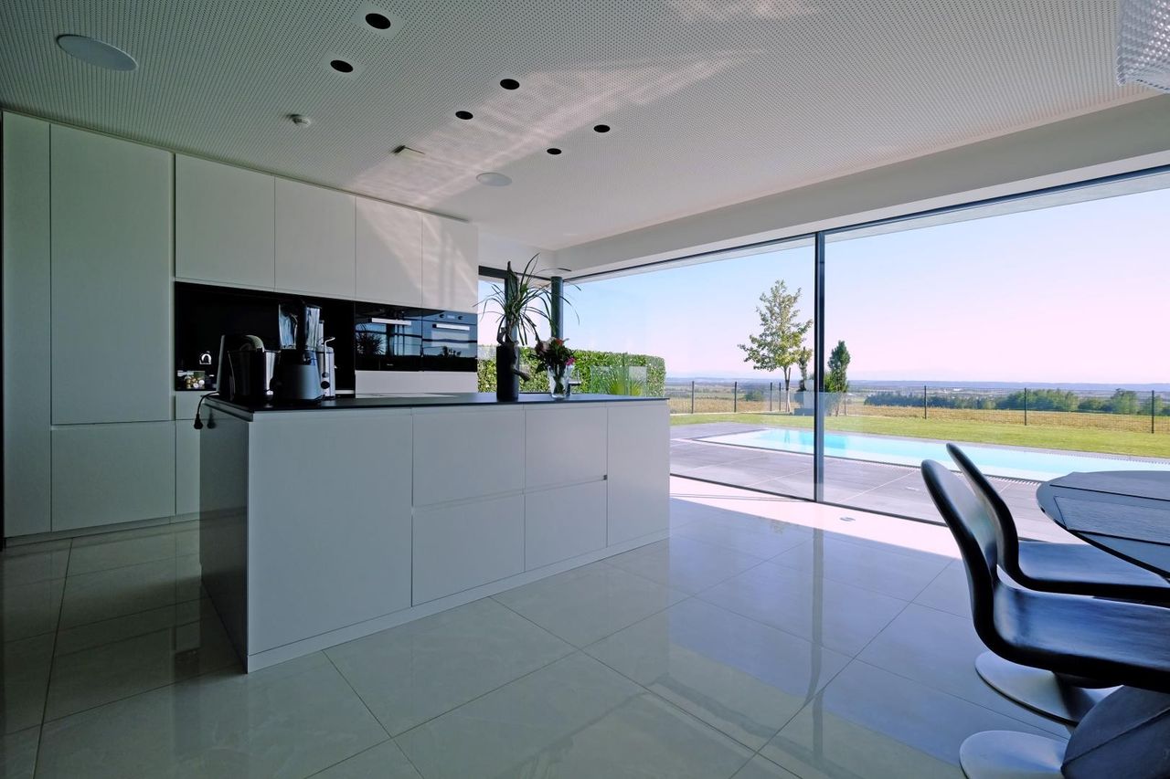 Die gesamte Ebene ist Richtung Süden verglast und mit Schiebeelementen ausgestattet. Diese Großzügigkeit und der Weitblick in die Natur vermitteln ein Gefühl von Freiheit. Ein schönes Gästebad, mehrere Nebenräume, sowie der direkte Zugang zur Garage, runden das Platzangebot im EG (ca. 140 m2) ab.