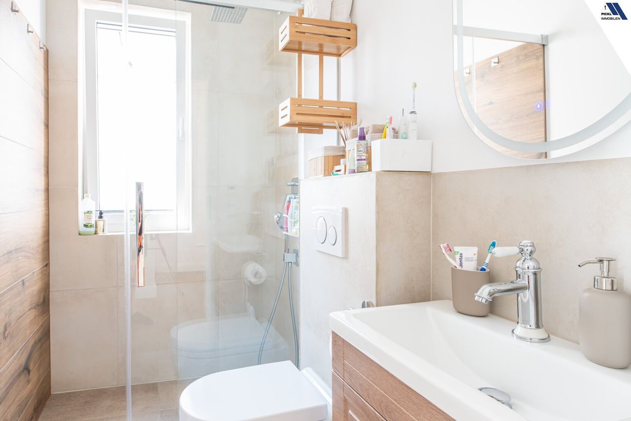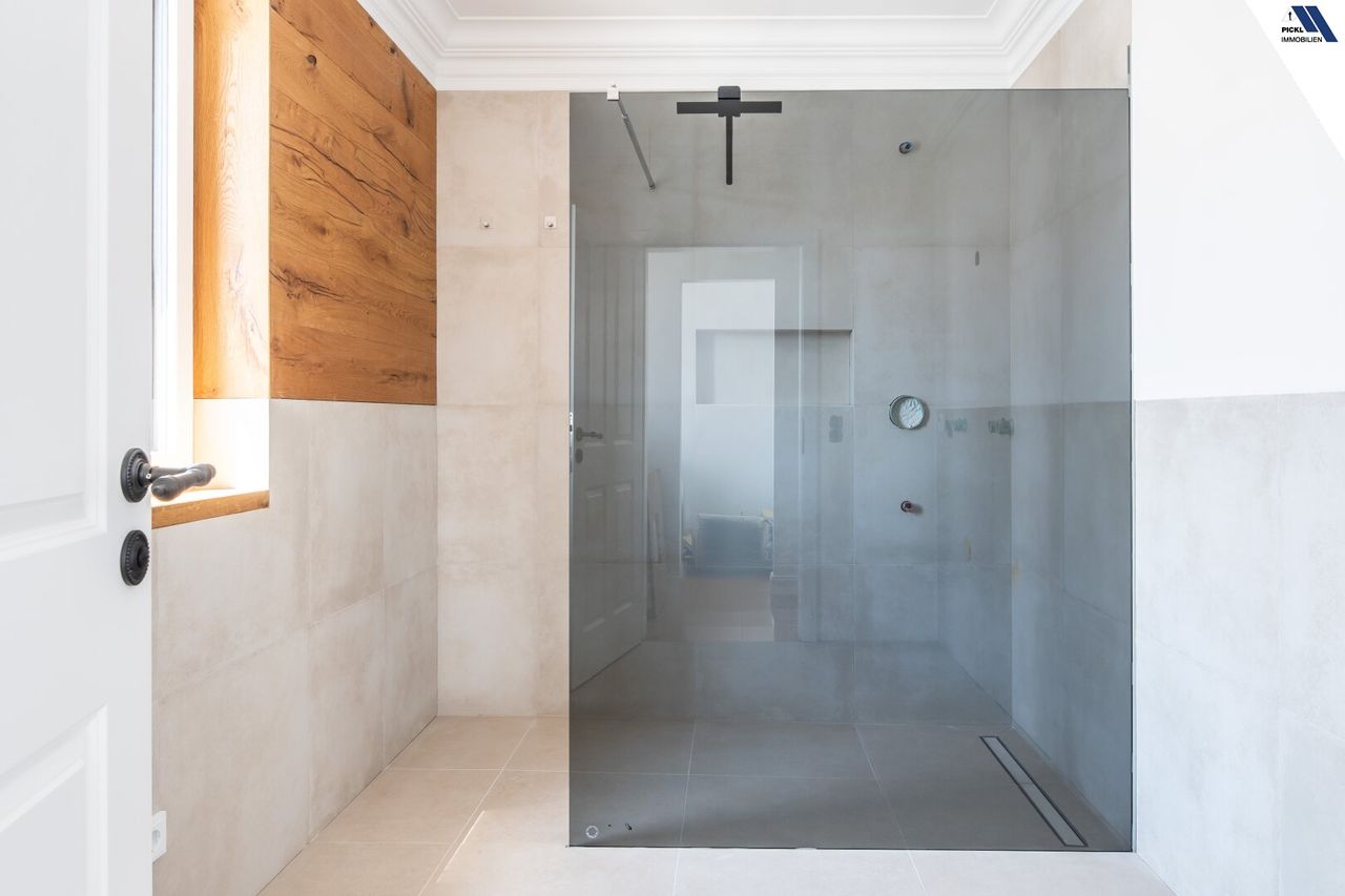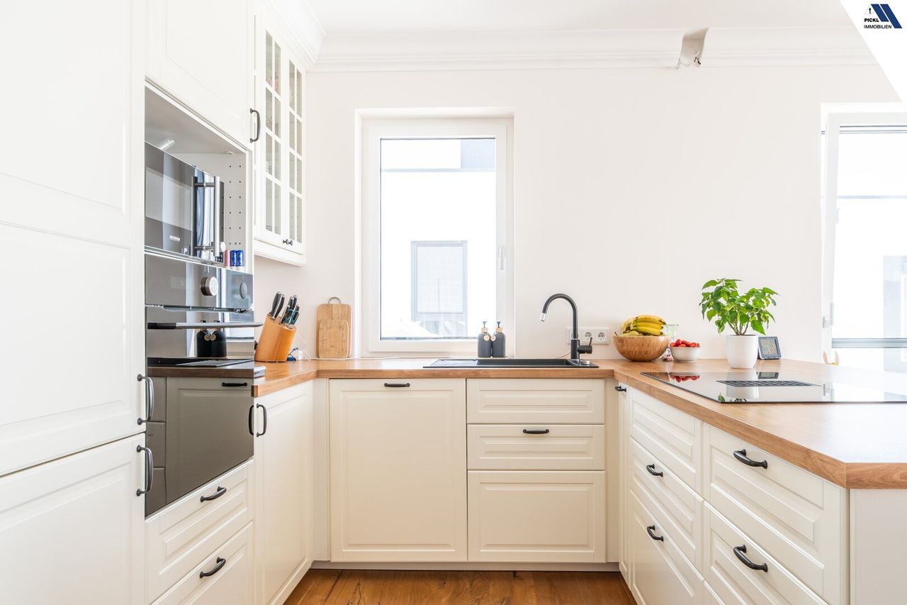 Hochwertiger Parkettboden verleiht den Wohnräumen eine warme und einladende Atmosphäre. Die moderne Einbauküche ist nicht nur funktional, sondern auch ein optisches Highlight, das zum gemeinsamen Kochen und Verweilen einlädt. Die Bäder sind lichtdurchflutet dank großer Fenster und verfügen über eine elegante Dusche – ein perfekter Ort zum Entspannen.